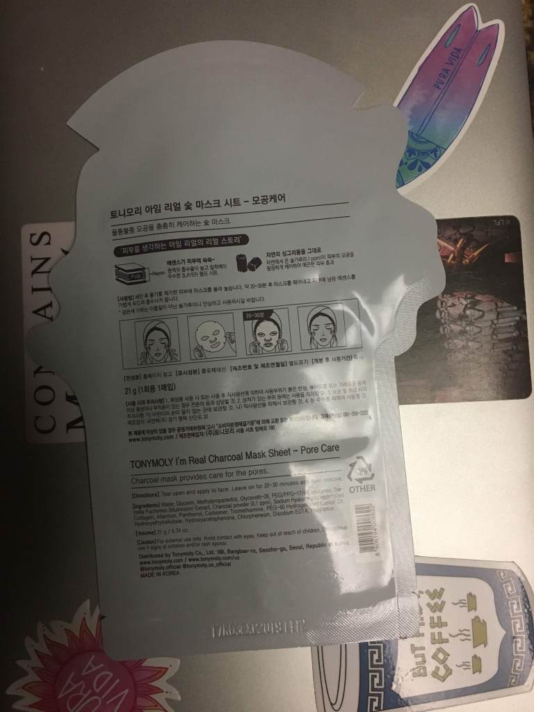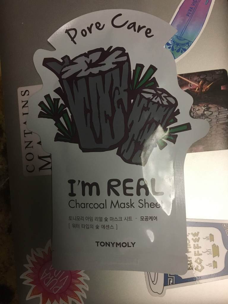 After steaming, I patted my face dry with a clean towel, and put on this TonyMoly charcoal sheet mask. Many of you may know of my love affair with charcoal in my skincare routine.