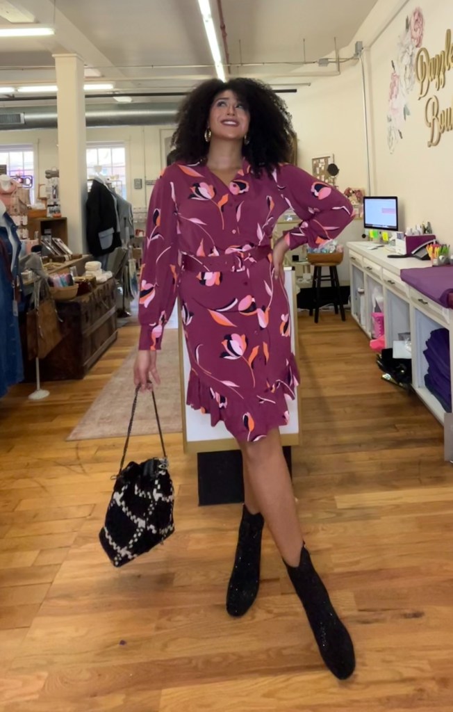 Maroon is one of my wardrobe staple colors – and there’s nothing I like more than a garment that can be dressed up or down. Paired with these sparkly Diverse Style by Sydni Dion booties, the dress works as the stand out piece, perfect for a casual date night, or a family holiday. I can also see this dress being great for work – worn with tights and a denim jacket.