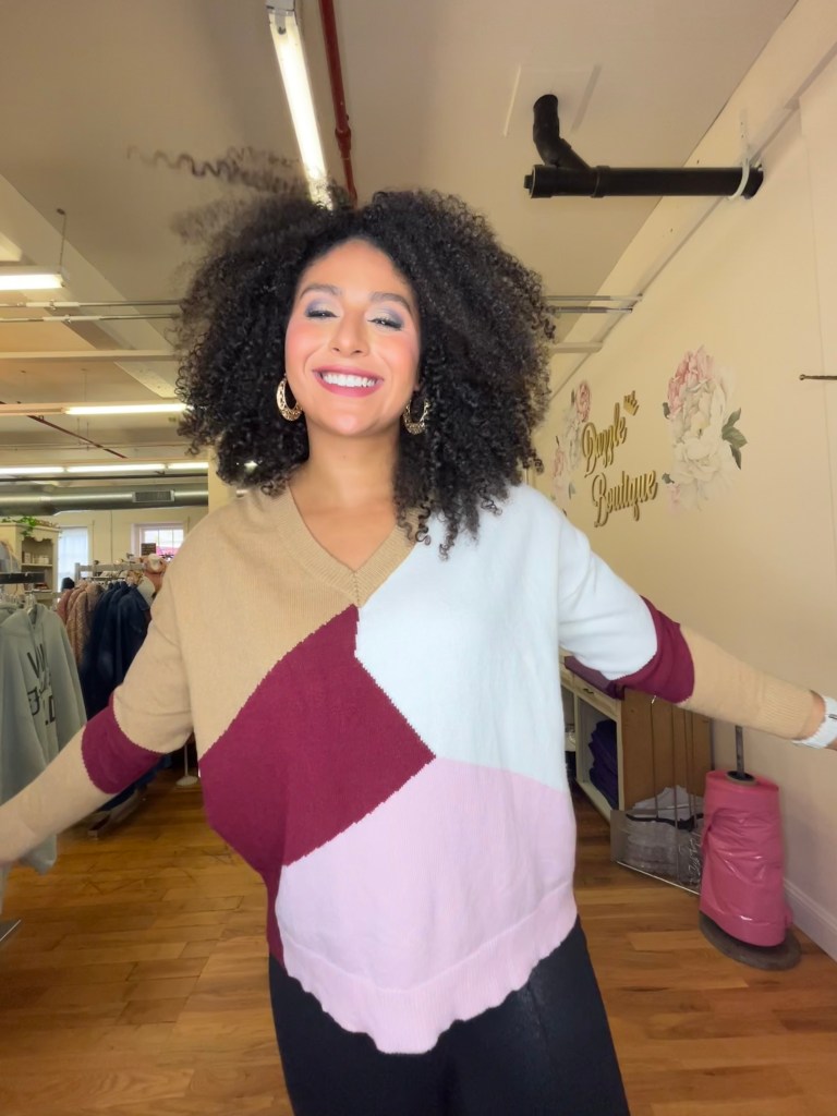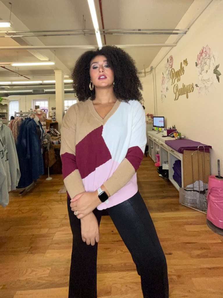 I loved the fit of this sweater – it’s fitted on the arms and boxier around the torso, making it a piece I would reach for to celebrate any Autumnal holiday! And it’s so cozy, you could easily wear this to work, to run errands, or to spend a casual weekend with your loved ones!