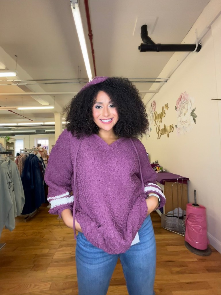 This sweater was one of the newest items in stock and it was the most delicious, snuggly fabric – like wearing a blanket all day long! It features a hood which isn’t something I go for (because my hair overpowers head-accessories), but adds a casual-ness that makes this sweater super fun for hanging out with friends!