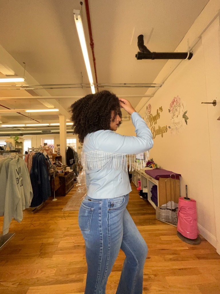 I saw this amazing leather jacket during the grand opening celebrations and I knew I was going to have to come back to play around with it, but I’m not sure how I would actually style it in real life. The rhinestone fringe stretches up both arms and across the back – making it a true stand-out piece – but that also makes it difficult for me to style. I’d want the jacket to be my standout piece, so I think I’d wear it over a simple slip dress and use the shoes and other accessories to dress it up or down.