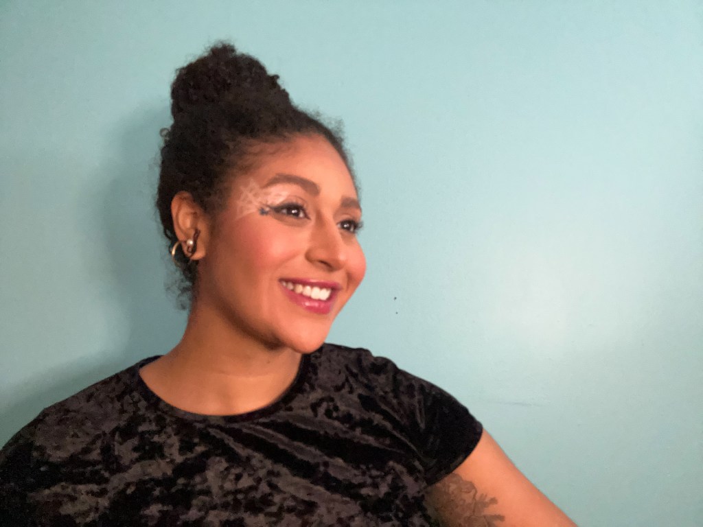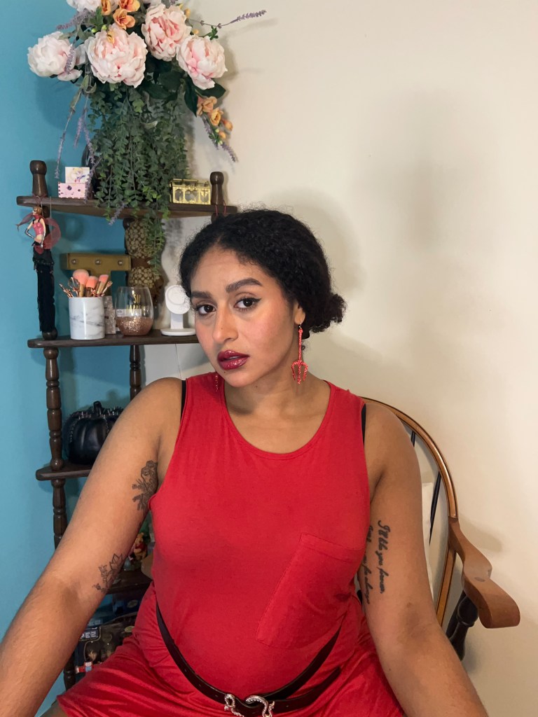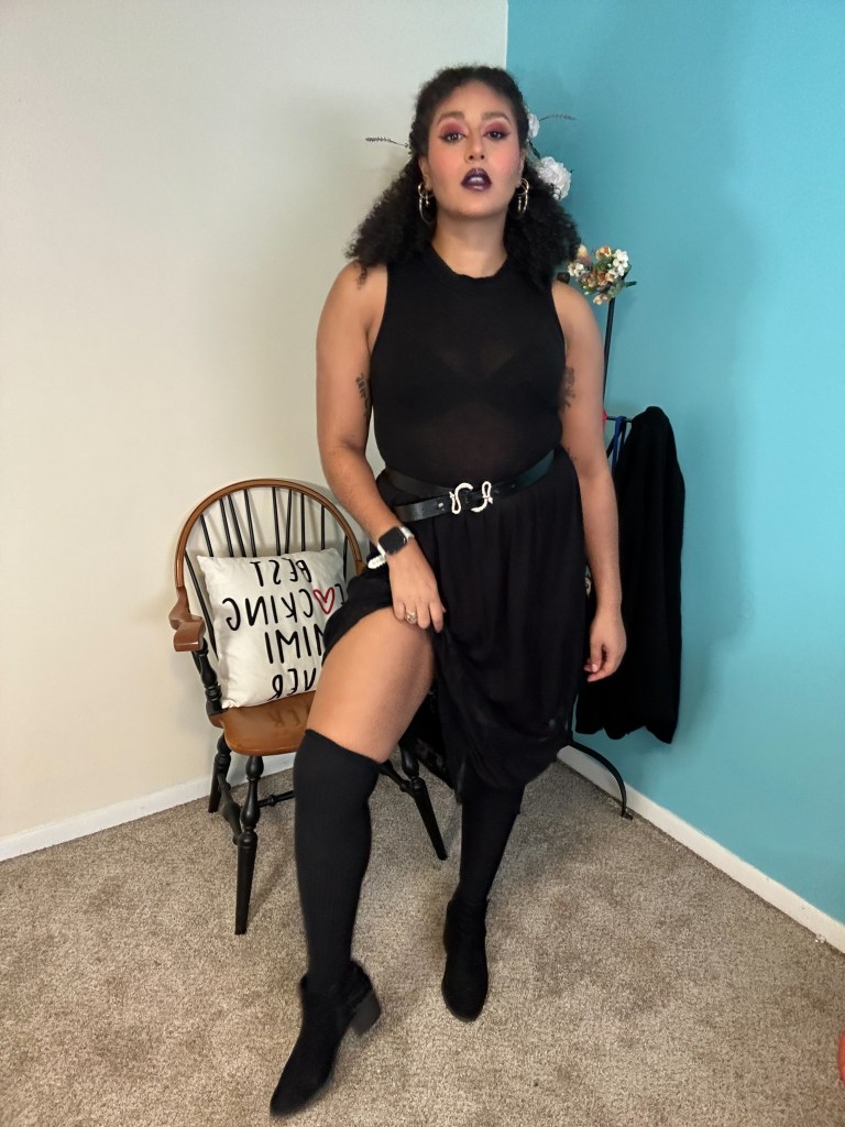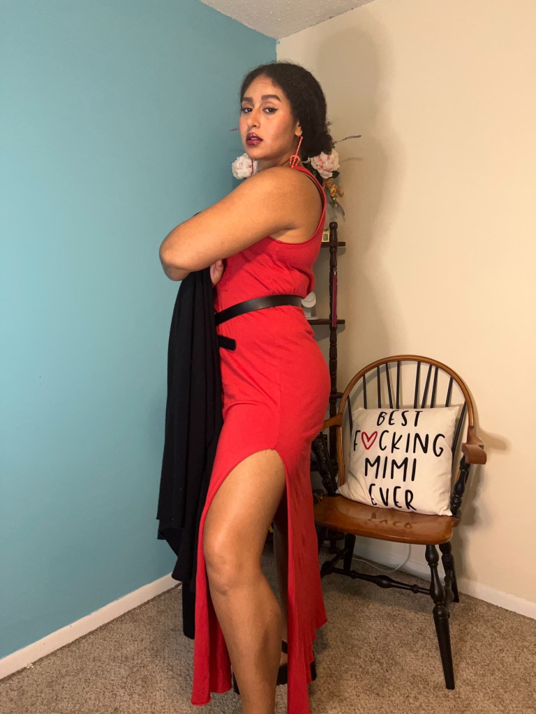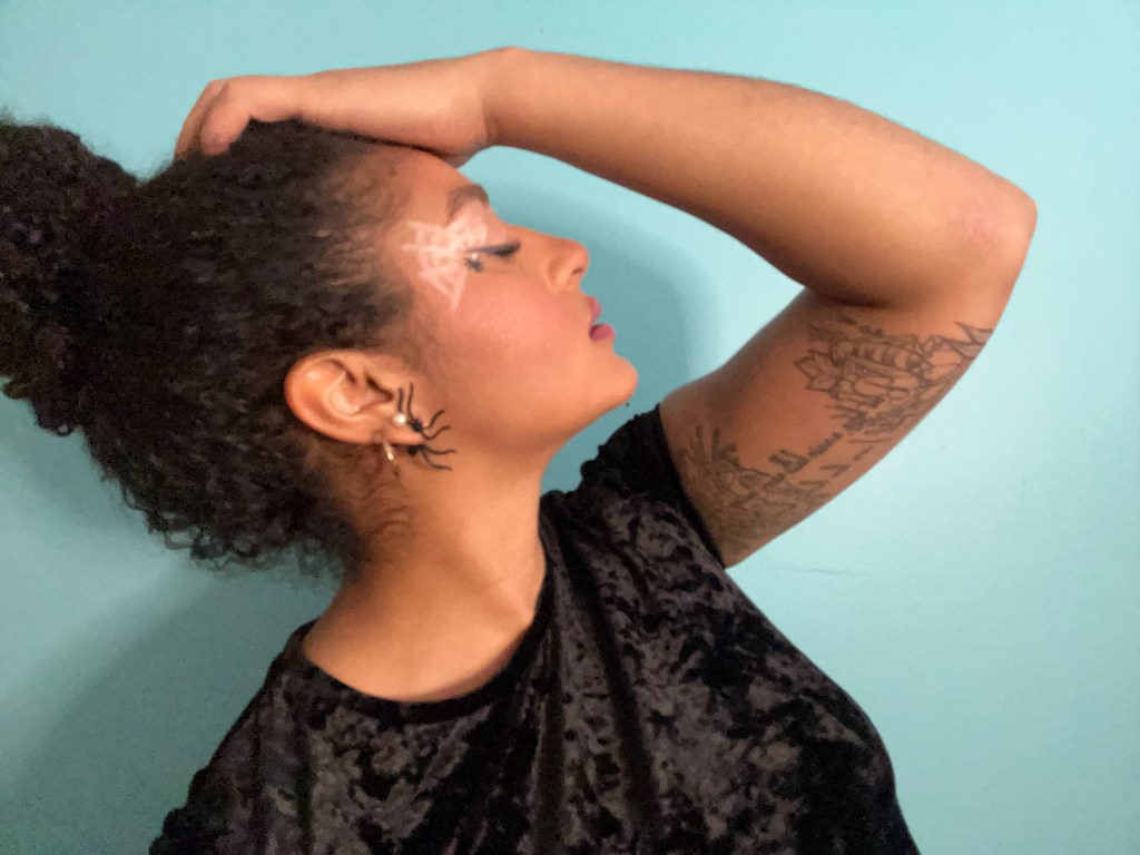 Accessories consisted of my go-to rhineestone snake belt from SheIn, and a pair of hoop earrings that feature dangling bats! Because I was wearing an interesting earring, I decided to keep my hair simple and wrap my curls into a large bun.