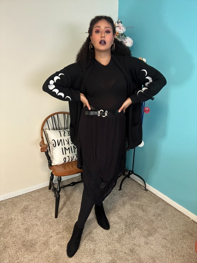 There’s something about head-to-toe black that just screams “Don’t mess with me” – the perfect look for a badass witch! I paired a black handkerchief skirt with my trusted Forever 21 mock neck bodysuit and knee high socks. I continued the all black theme with a pair of booties that I got from Plato’s Closet, and topped the look off with this Hot Topic moon phase cardigan.
