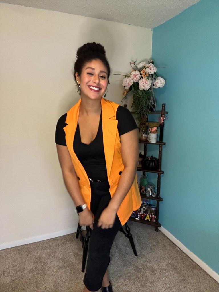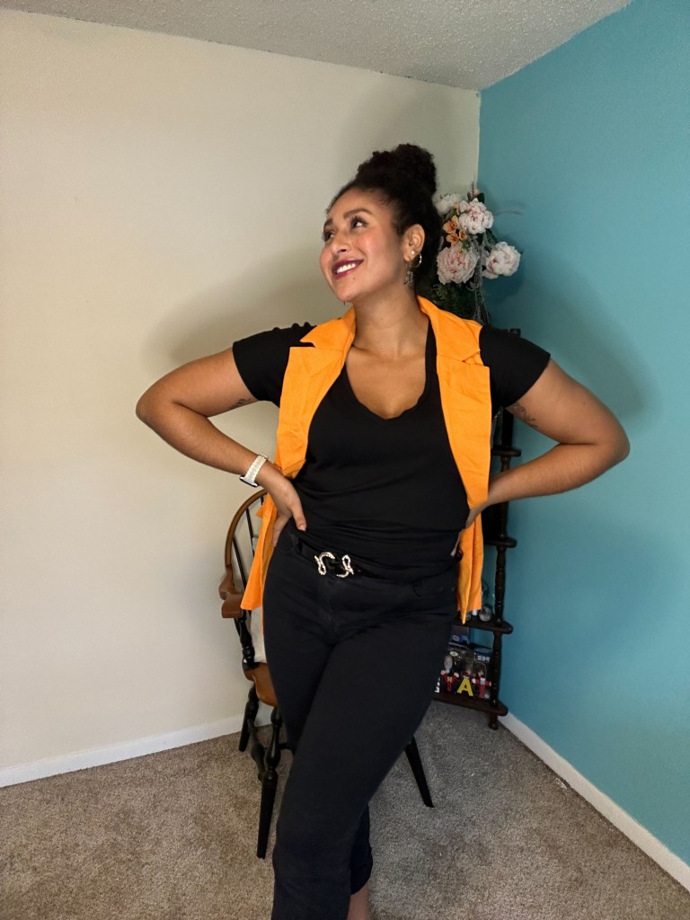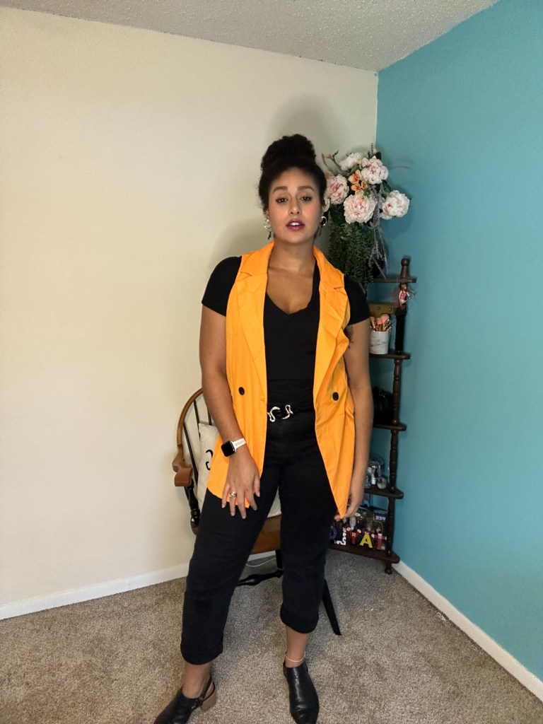 Nothing says Halloween like the iconic color duo of black and orange! To channel the holiday in a subtle way, I styled this SheIn Double Breasted Vest with a black T-shirt and black jeans that I wore cuffed. I finished off this look with the perfect Autumnal shoe – a pointed toe, sling back with the tiniest heel – I call them my “peasant shoes”, but please let me know if theres a proper name for this style of shoe!