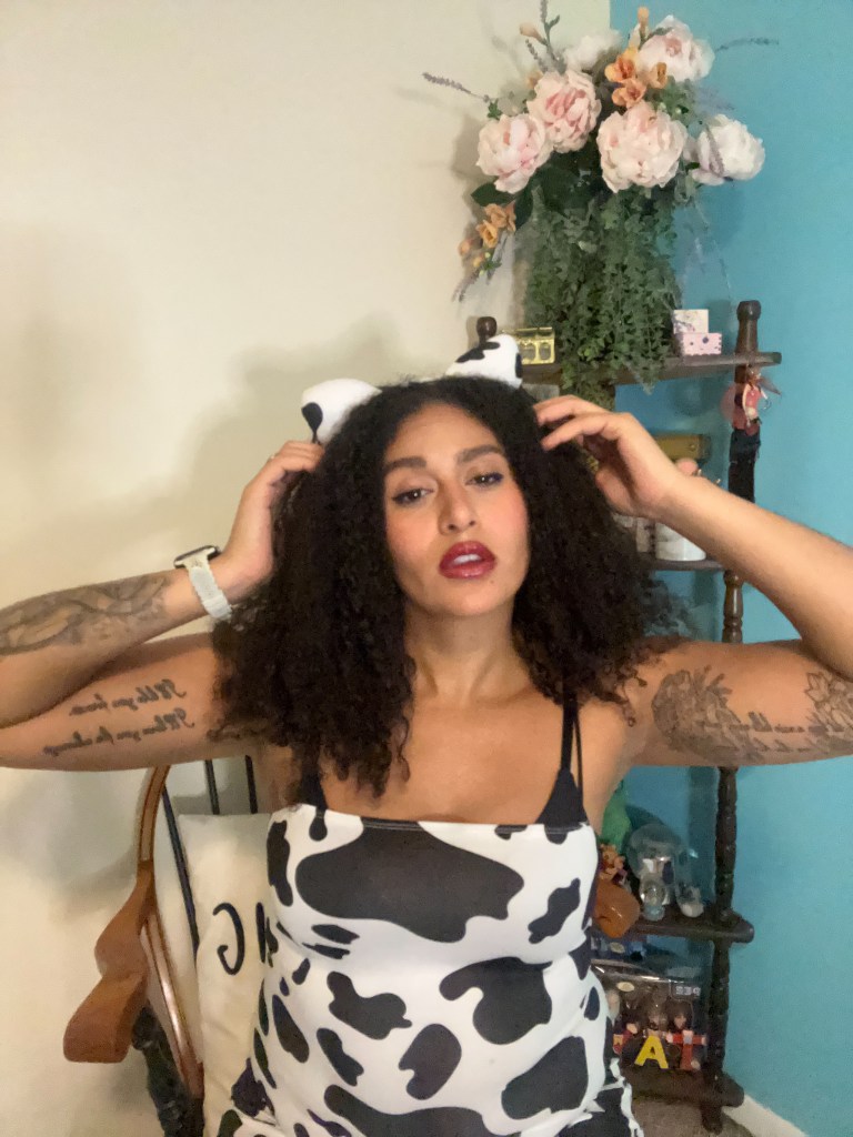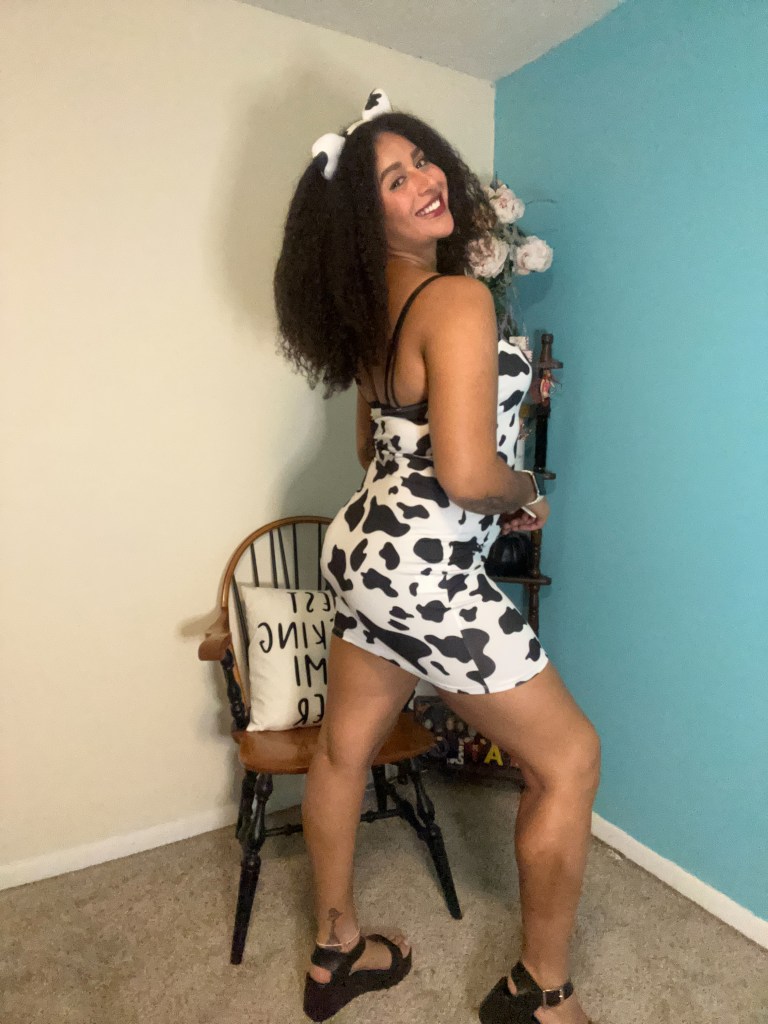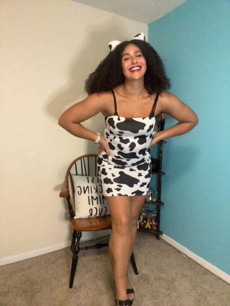It’s completely by accident that I even own cow print clothing. I ordered this cow print mini dress as a joke after hearing Doja Cat’s song “Moo,” and almost a year later I ordered the headband as part of cow themed costume. Both the dress and the costume are from SheIn.