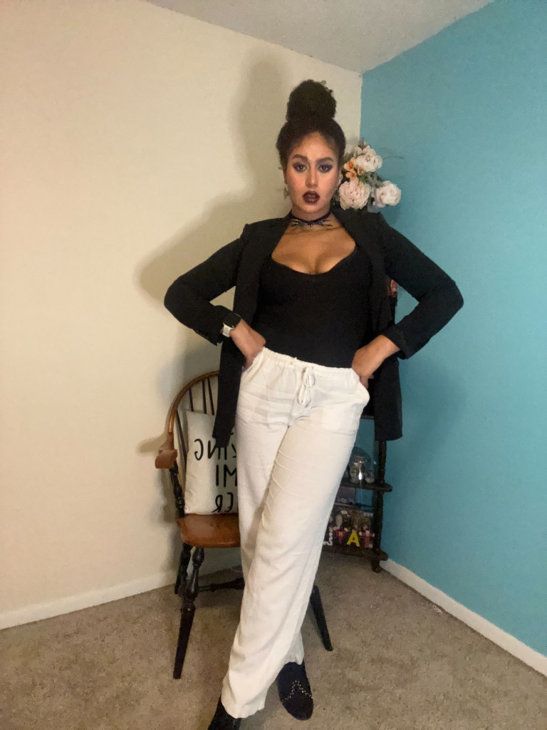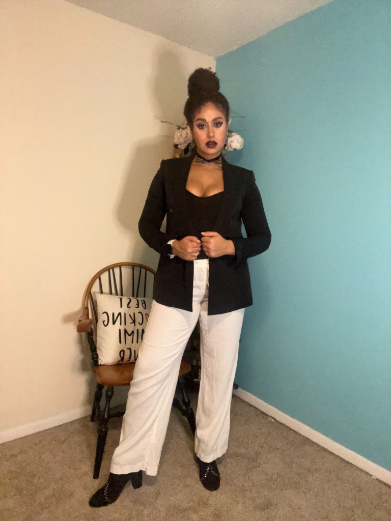 Arguably my favorite look from this series, I recreated one of my favorite Halloween characters – Jack Skellington. In college, I owned the perfect pair of white-and-black stripped, satin pants, which I wore for that rendition of this costume; but, in order to add a level of wearability I decided to break out my white linen trousers. I paired them with my trusted Forever 21 mock neck bodysuit and a black blazer.
