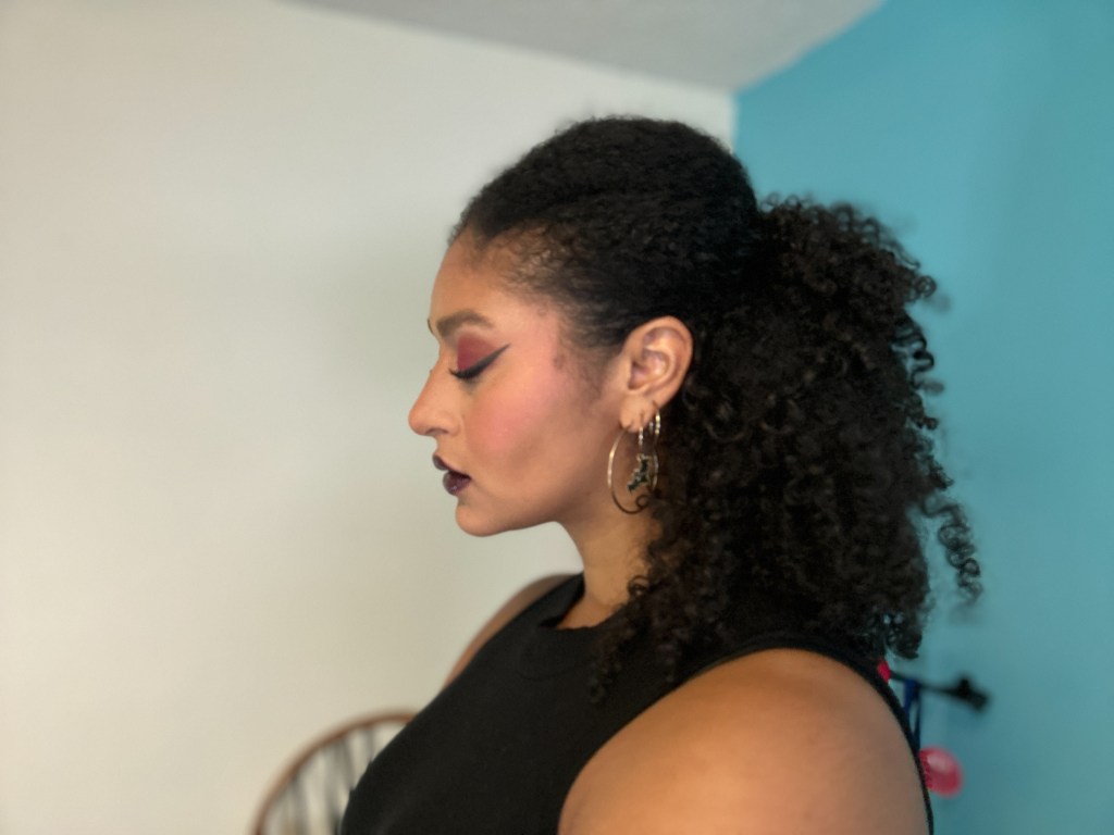 I kept my accessories to a minimum, wearing only a pair of hoop earrings. I left my curls loose, and created a clean winged liner eye in order to offset the deep purple lip. This lip was created using the same products as the above look, and I have to say, I’m becoming increasingly obsessed with dark lips! If you’re also a dark lip lover please leave your product recommendations in the comment section below!