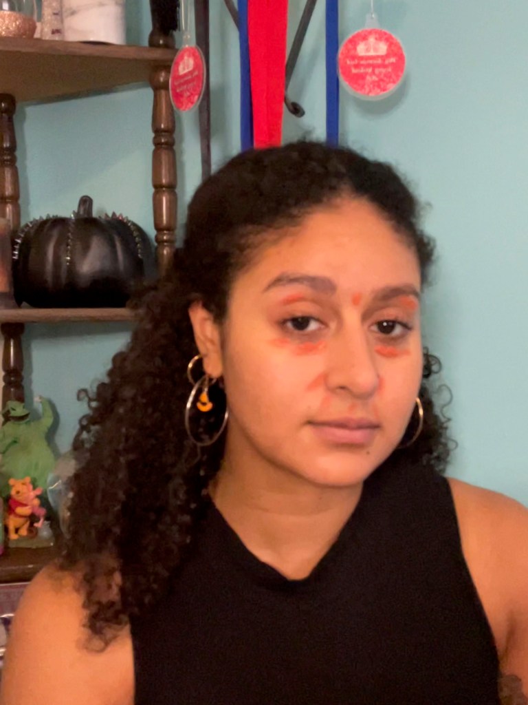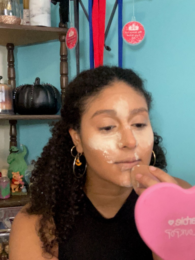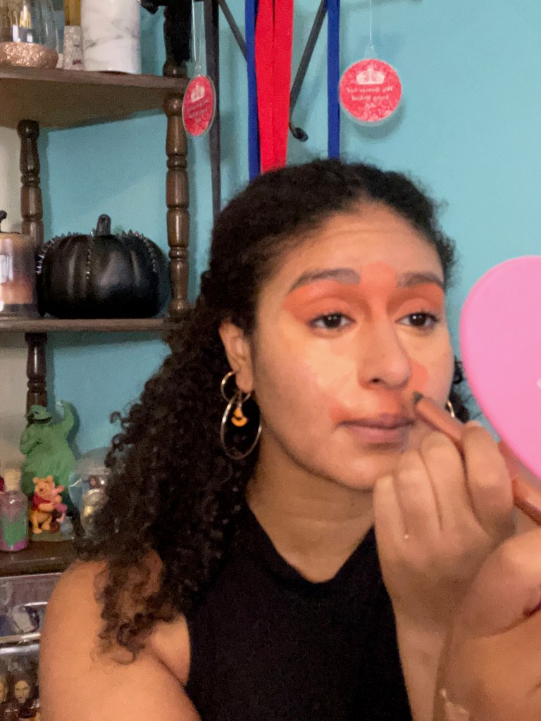 For a more defined evening look, I’ll use the Fenty Beauty Match Stix in shade Truffle 04. I apply this product in the same spots as the Tarte bronzer, and I’ll blend out the product using the same brush I used to apply the Tarte bronzer. In the moments when I apply too much contour and I’m having trouble blending with the brush, I’ll bounce my damp sponge in an upward motion.