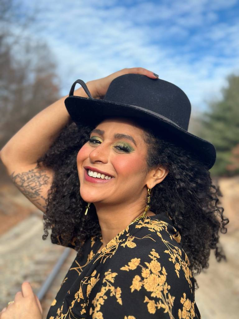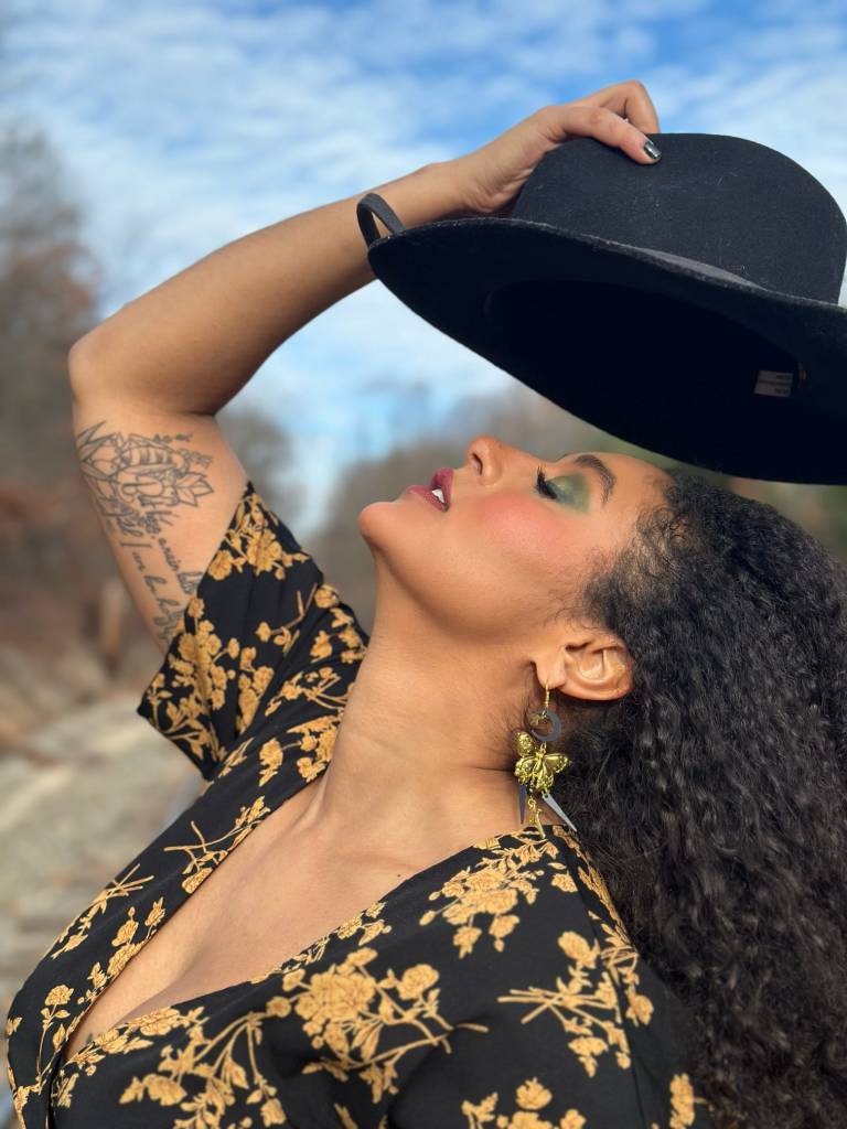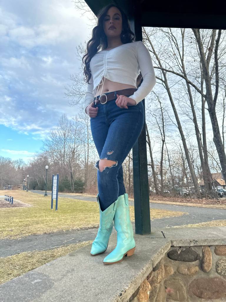 For this look, we added a bit of turquoise eyeshadow to Shelby’s look and changed into a soft brown lip. To pull in her turquoise boots, we added these turquoise sun earrings (one of Hubby’s Temu purchases!) and kept her outfit simple.