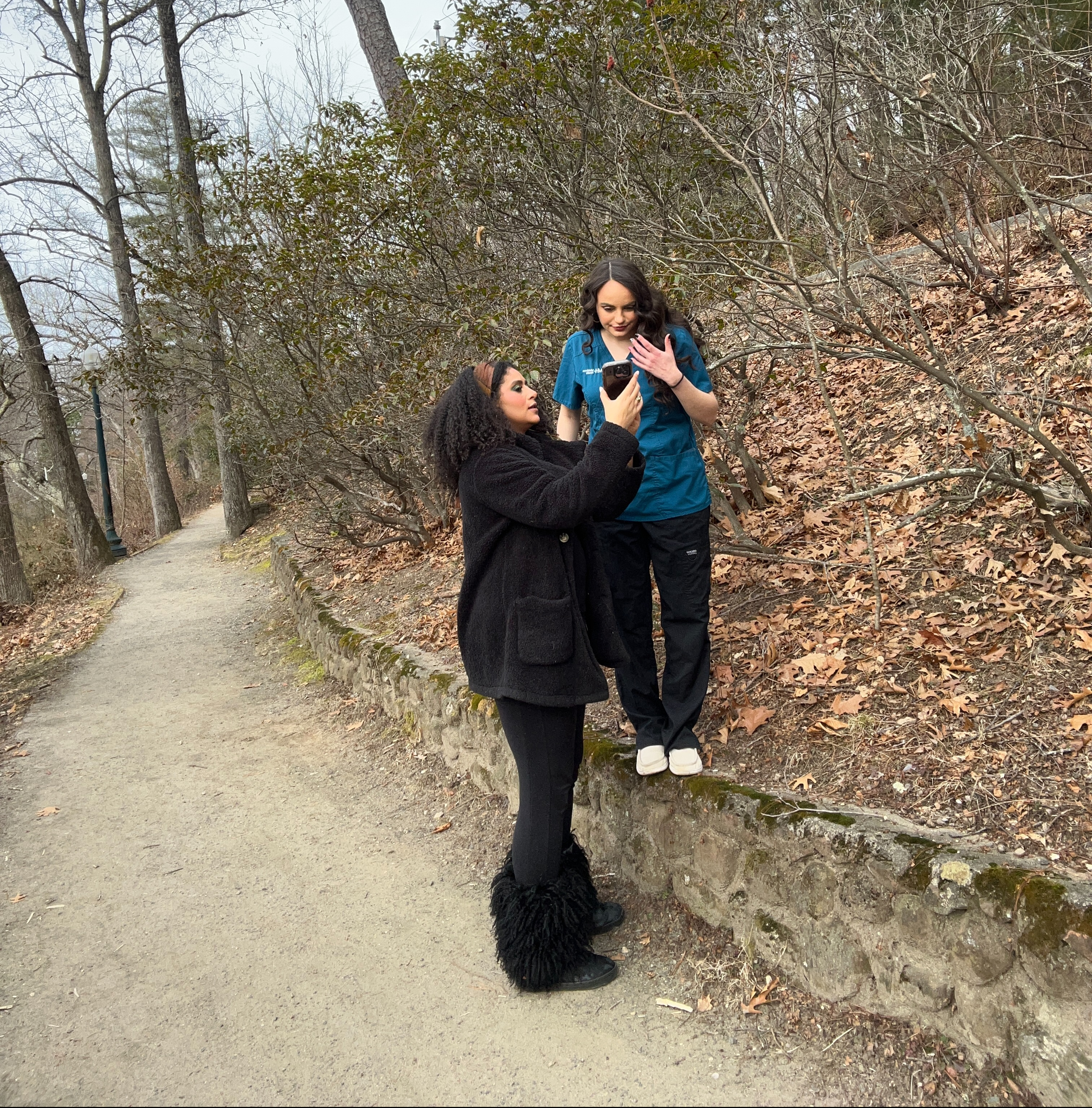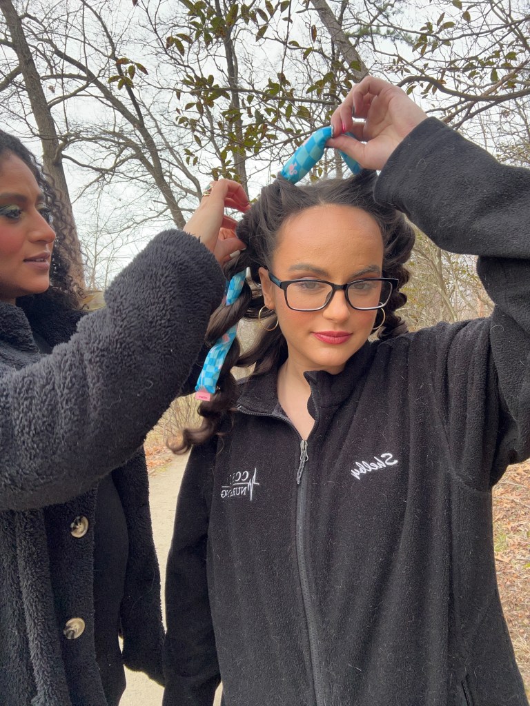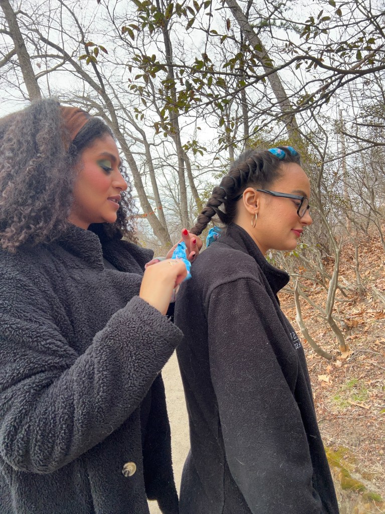 Because she didn’t have any foundation with her, I blended two samples that I got from Sephora – the Too Faced Born This Way foundation in shades ‘Nude’ and ‘Butterscotch’. Then I completed her base following the steps detailed in ‘How I Apply my Makeup Base‘ post. I created a soft eye look by using soft brown eyeshadows. Before starting her makeup I prepped her hair with Batiste dry shampoo, Texture I.D. Thermal Multi-Styling Foam, and the R+Co Freeway Defining Spray Gel before setting her hair in my heatless curling set by Kitsch. We didn’t take out the curler until we arrived at a copse of trees that had as much green as we could find!