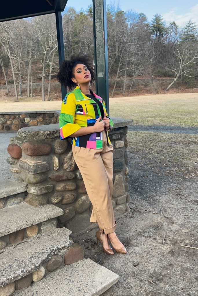 The morning of this shoot, I went hiking with our youngest sister and while I was at our mom’s house, she lent me this printed jacket. I wanted it to be the stand out item here, so I paired it with a pair of SheIn trousers, the black shirt from the first look (by DKNY), and a pair of flesh colored pumps by the brand Report, for a pop of color I added a skinny red belt. To let these earrings speak for themselves, I wore my hair up in a loose pineapple.
