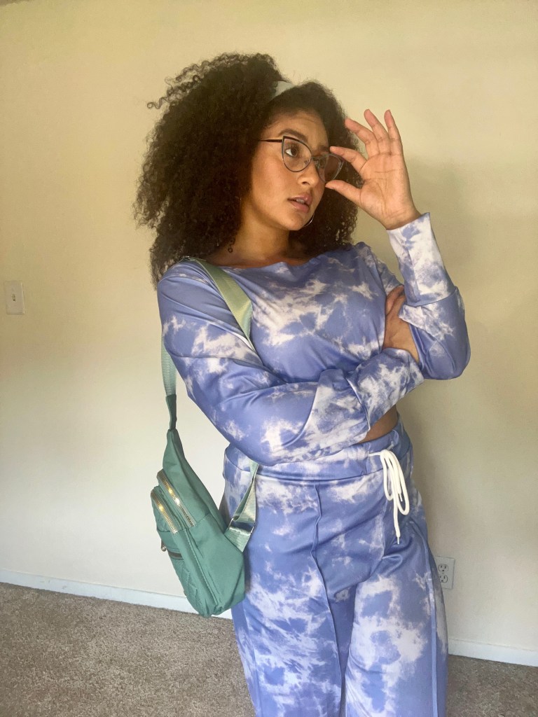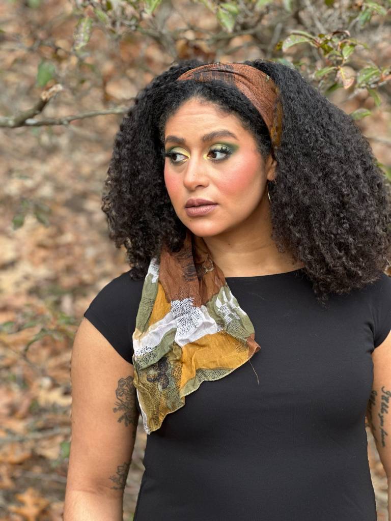 This is one of my go-to hairstyles, and can be created using any scarf or large scrap of fabric you have! You’ll want to begin by placing the scarf across your forehead, tying it behind your head. Them slide the scarf back until it’s placed exactly where you want it!