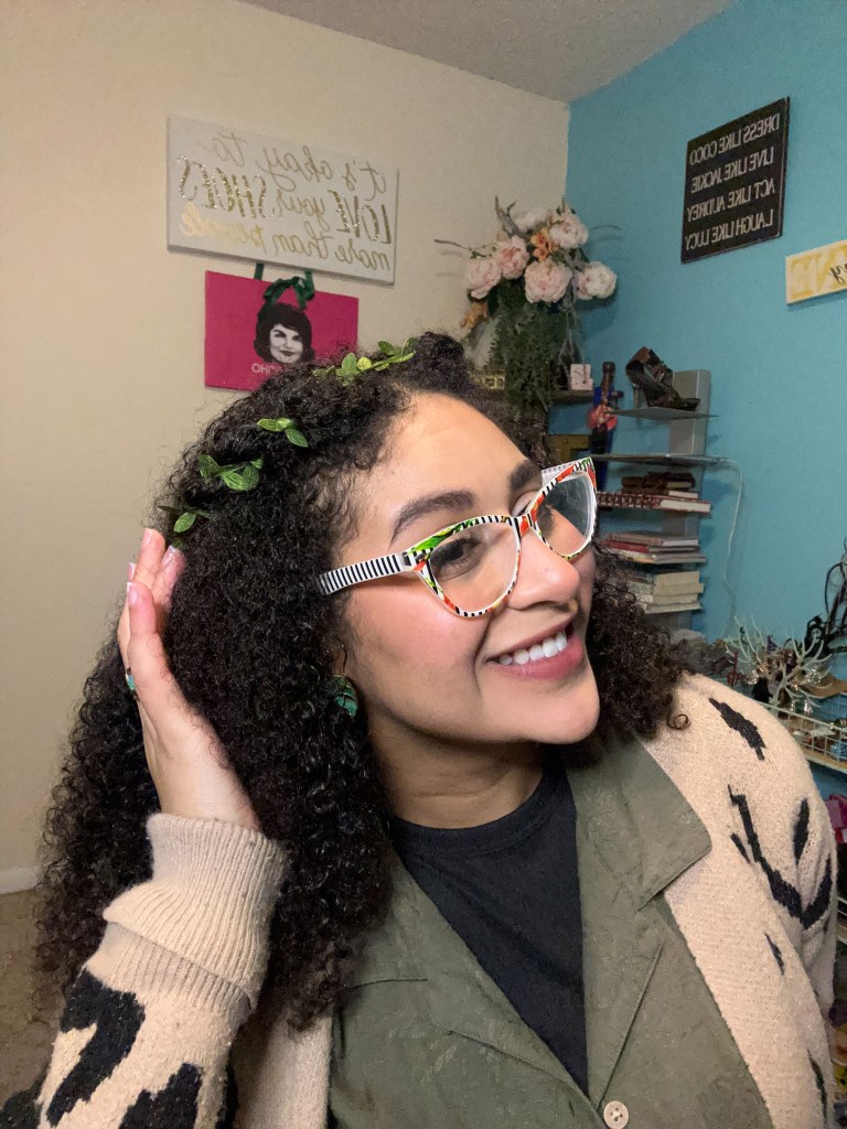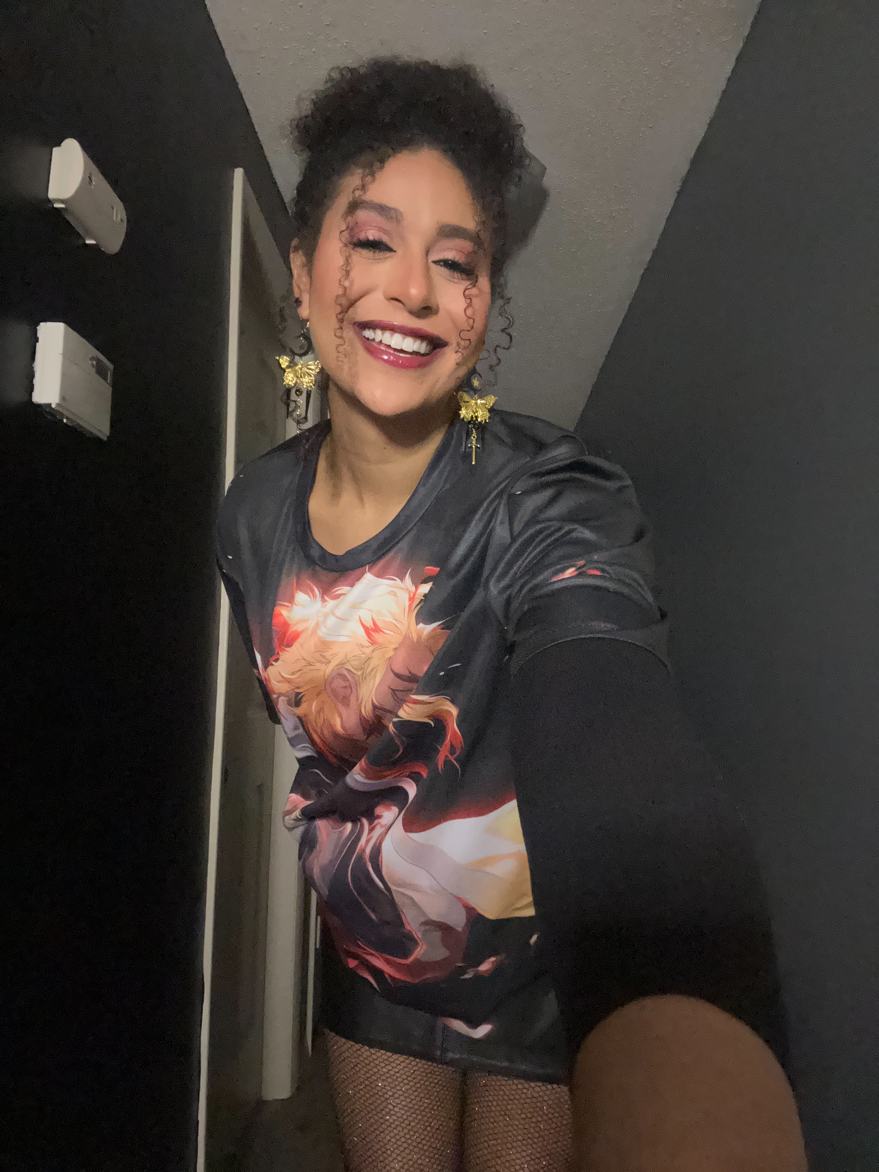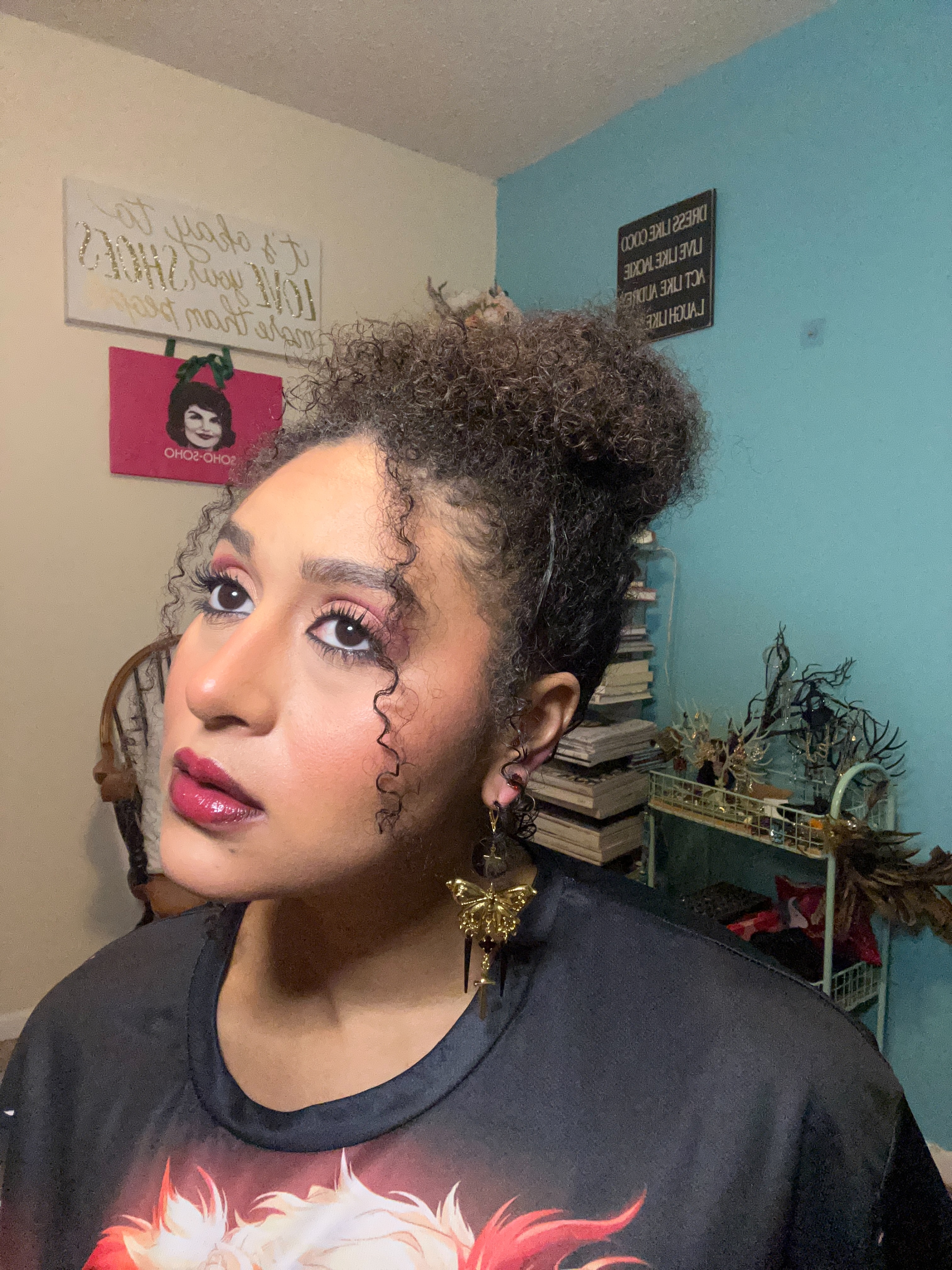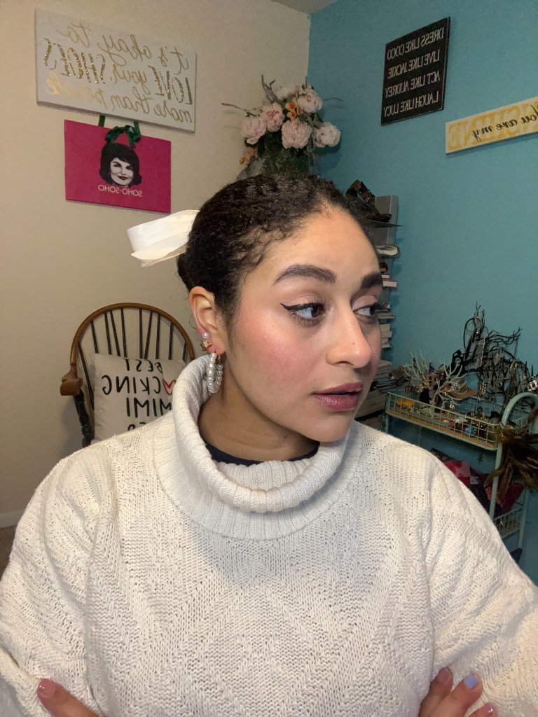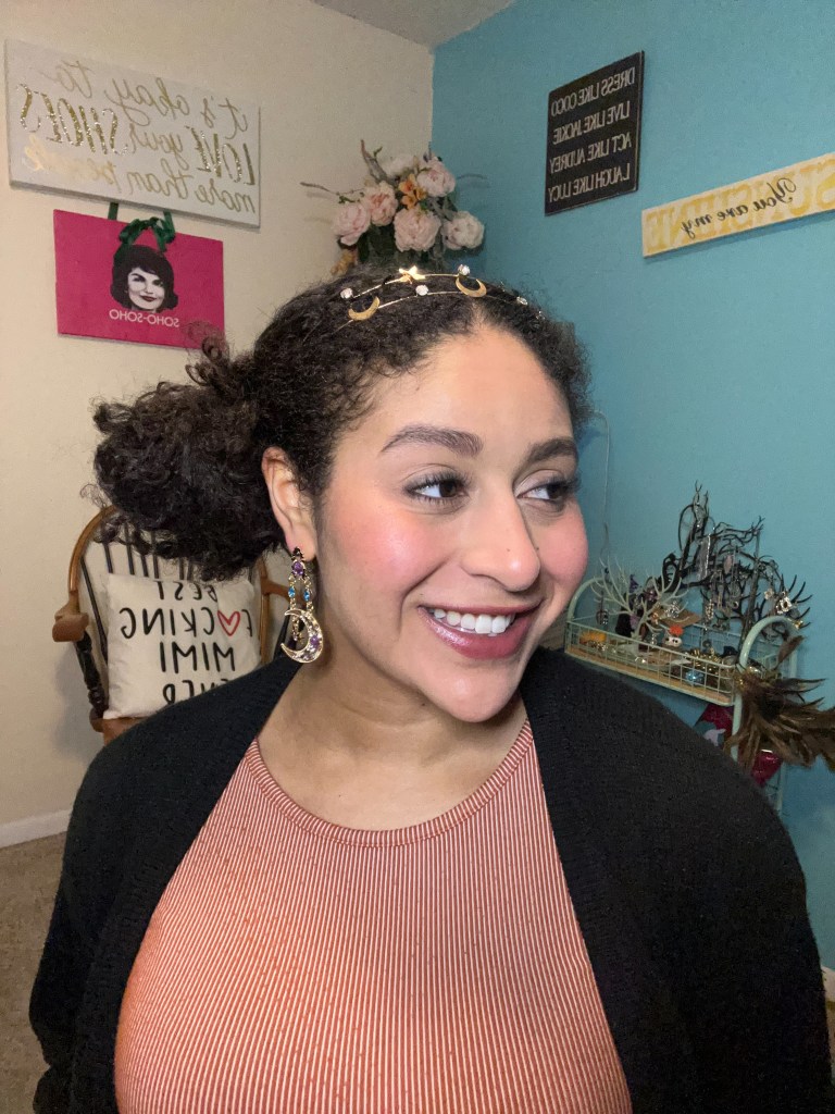 I first tried this look for New Year’s Eve and I didn’t hate how it turned out, but I knew I could do better. So, I tried it again for the second anniversary of our first date dinner back in January and it came out so much better! If you’re a curly girl like me, I recommend making a messy bun as high up on your head as possible, and forget using hair pins – just use a regular hair tie to secure your bun and manipulate the curls that stick out. Don’t forget to leave some face-framing pieces out – I like to finger coil these pieces for added definition!