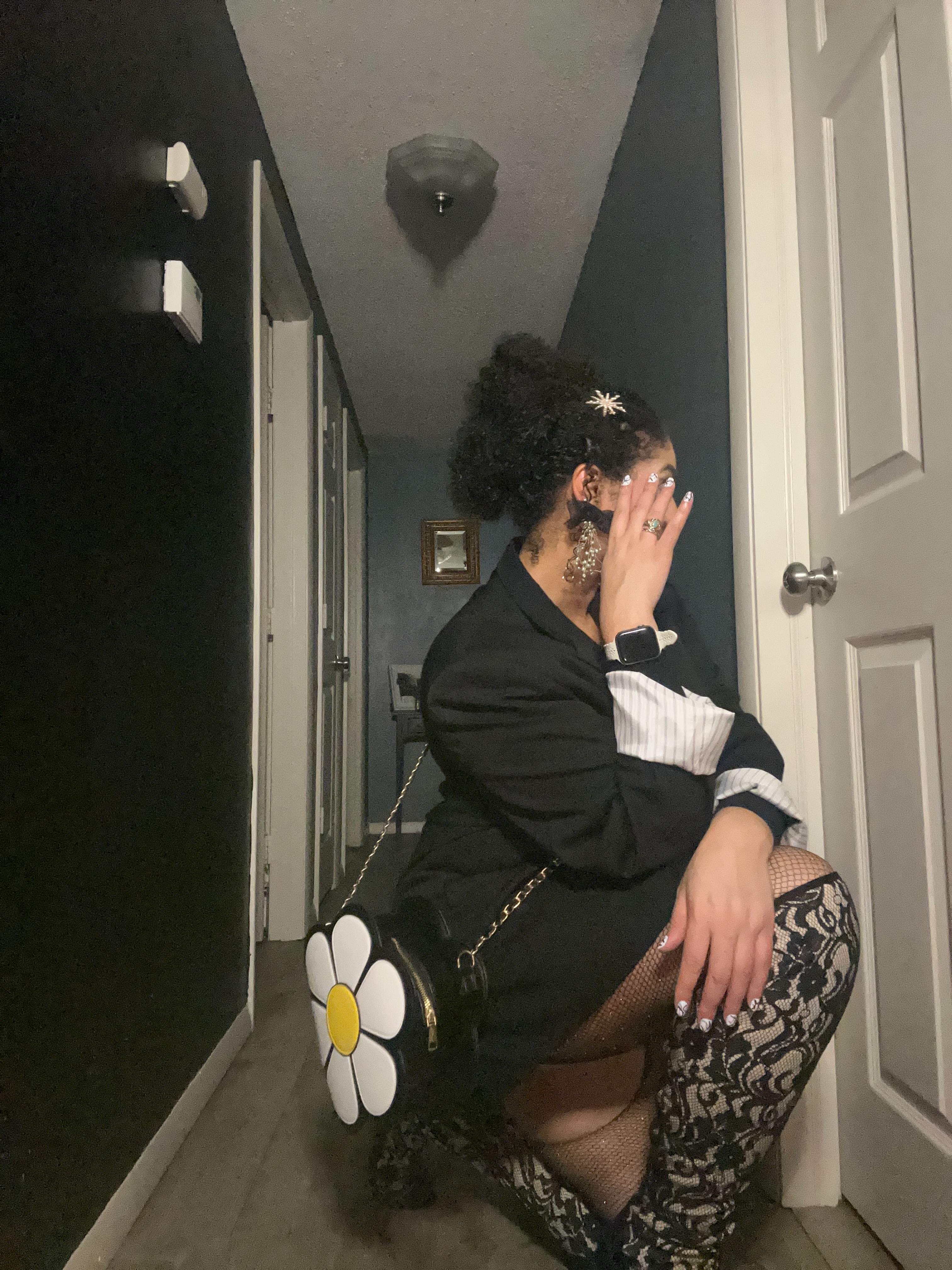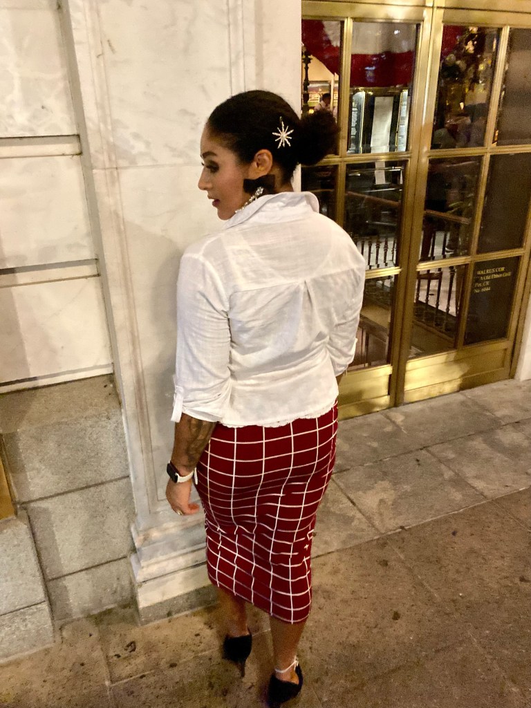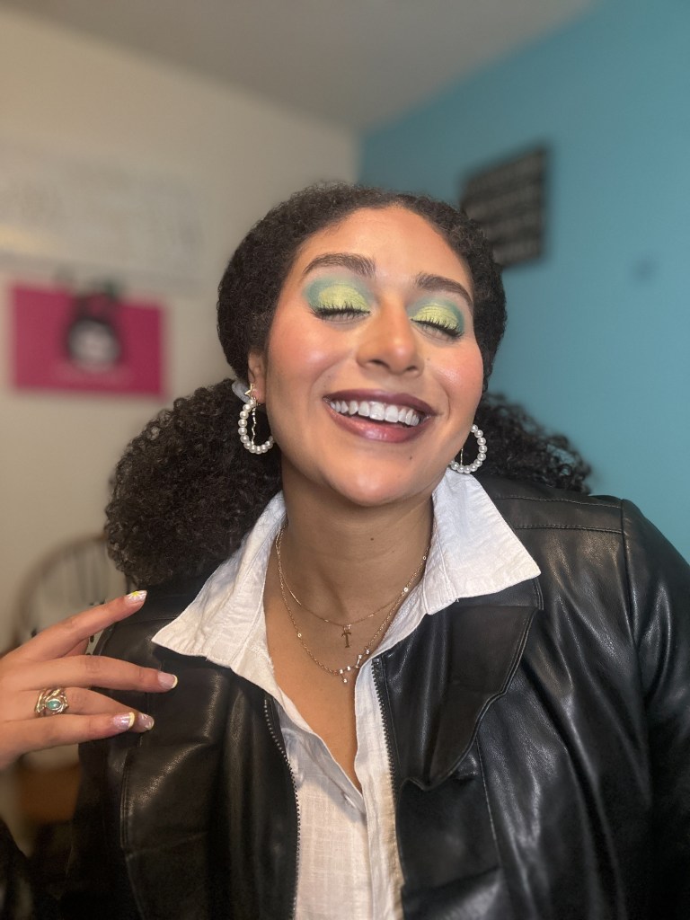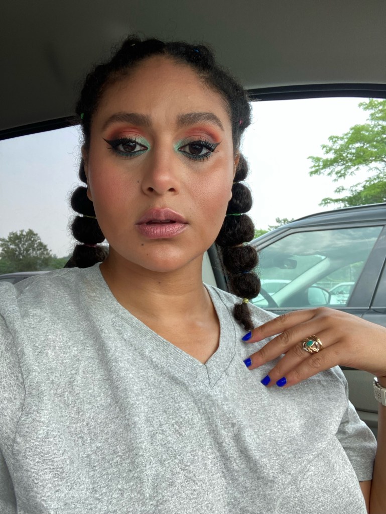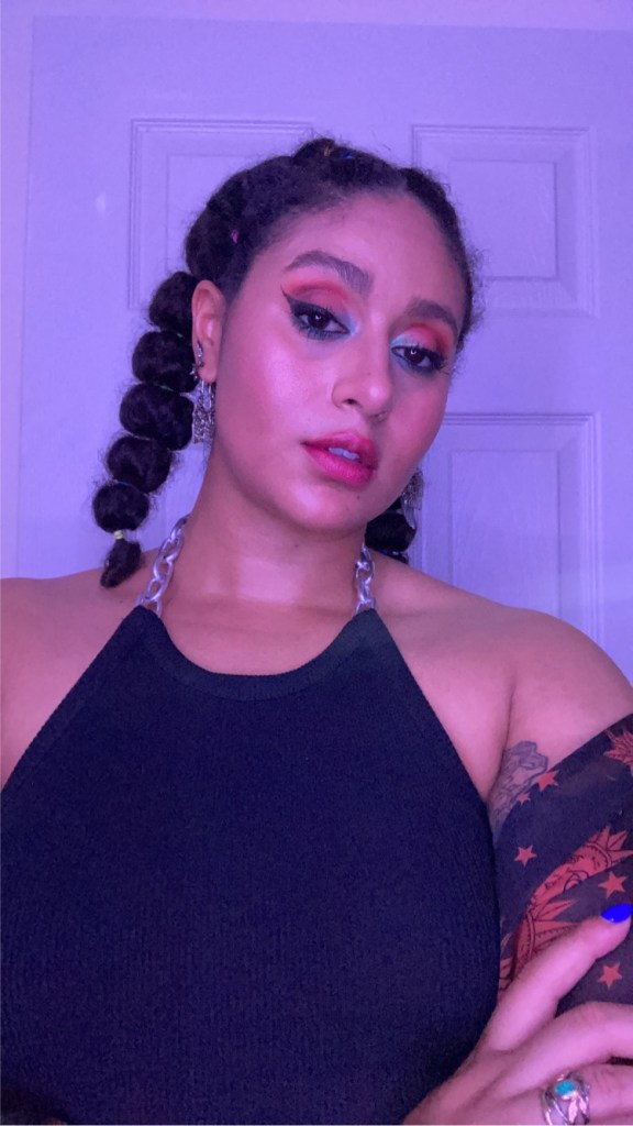 I first tried this look for New Year’s Eve and I didn’t hate how it turned out, but I knew I could do better. So, I tried it again for the second anniversary of our first date dinner back in January and it came out so much better! If you’re a curly girl like me, I recommend making a messy bun as high up on your head as possible, and forget using hair pins – just use a regular hair tie to secure your bun and manipulate the curls that stick out. Don’t forget to leave some face-framing pieces out – I like to finger coil these pieces for added definition!