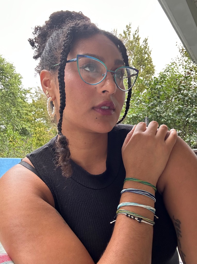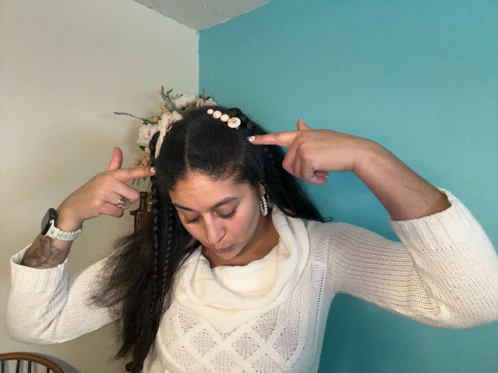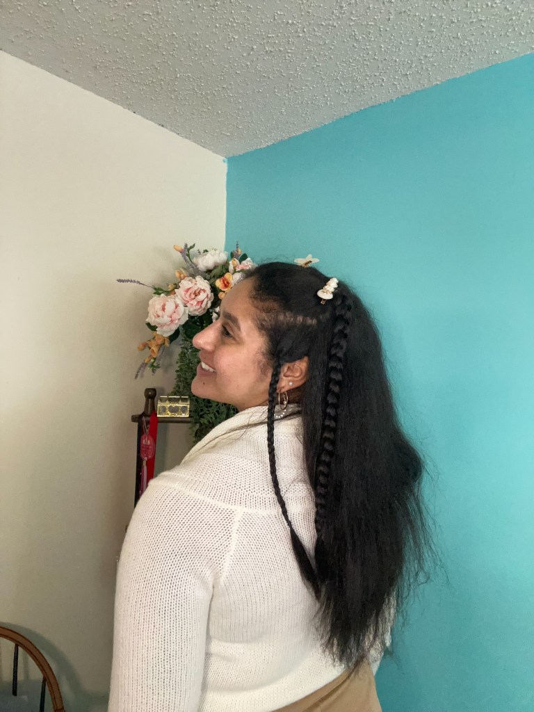 The last time my hair was straight I tried to be more creative while styling it; I started by pulling the crown of my hair back as though I was going to create a pig-tail-half-up-half-down, but then I braided each pig-tail, and attached a clip at the top. At this point the look still needed something, so I braided the sections between my temples and my ears as well.