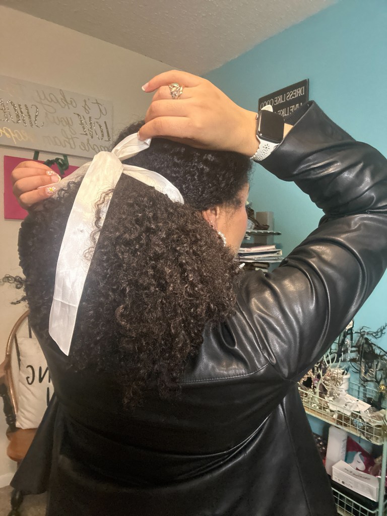 I’m not sure if this style has a proper name, but this has long been one of my favorite ways to restrain my curls without leaving crease marks. Similarly to using a ribbon or scarf as a headband, you’ll want to begin by draping the ribbon over your shoulders from the back of your neck. Once you have an even amount of ribbon on both sides, you’ll bring the ends up. Cross them once (without tying at this step), and slide the ribbon back into place. The placement will be determined by how secure you want your hair, and exactly where you’d like to secure your hair. I like to bring my ribbon down into “low ponytail” territory. Depending on how long your ribbon is, you can wrap the ribbon around your hair more than once, or, you can tie it off into a bow and let the lengths trail free!