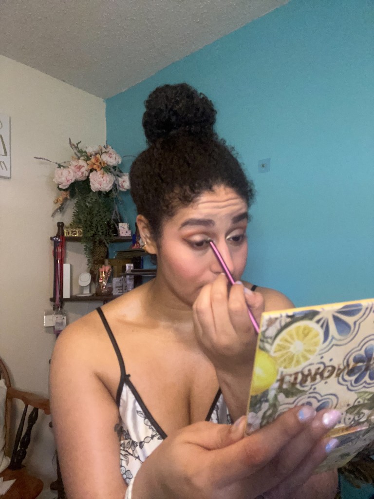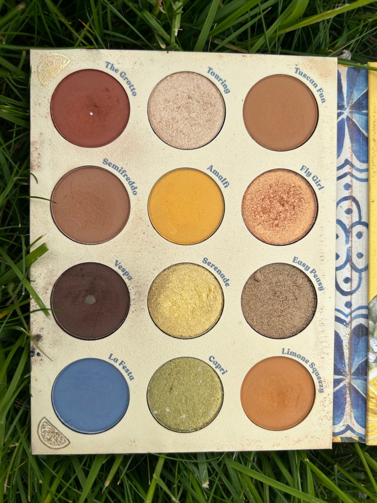 For this look, I’ll be using the (limited edition) ColourPop Limoncello palette, but you can use any palettes that have these warmer hues. This Temptalia review discusses each shade in the 12-pan palette, and lists out dupes for each!