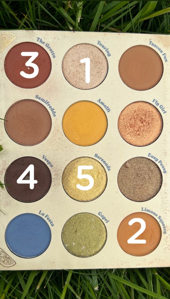 Starting with the shade Touring (1), I used a small flat brush to swipe it below my eyebrows as a highlight shade. Then I used a rounded and pointed brush to apply Limone Squeezy (2) in and slightly above my crease, as well as along my lower lash line.