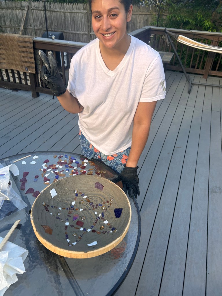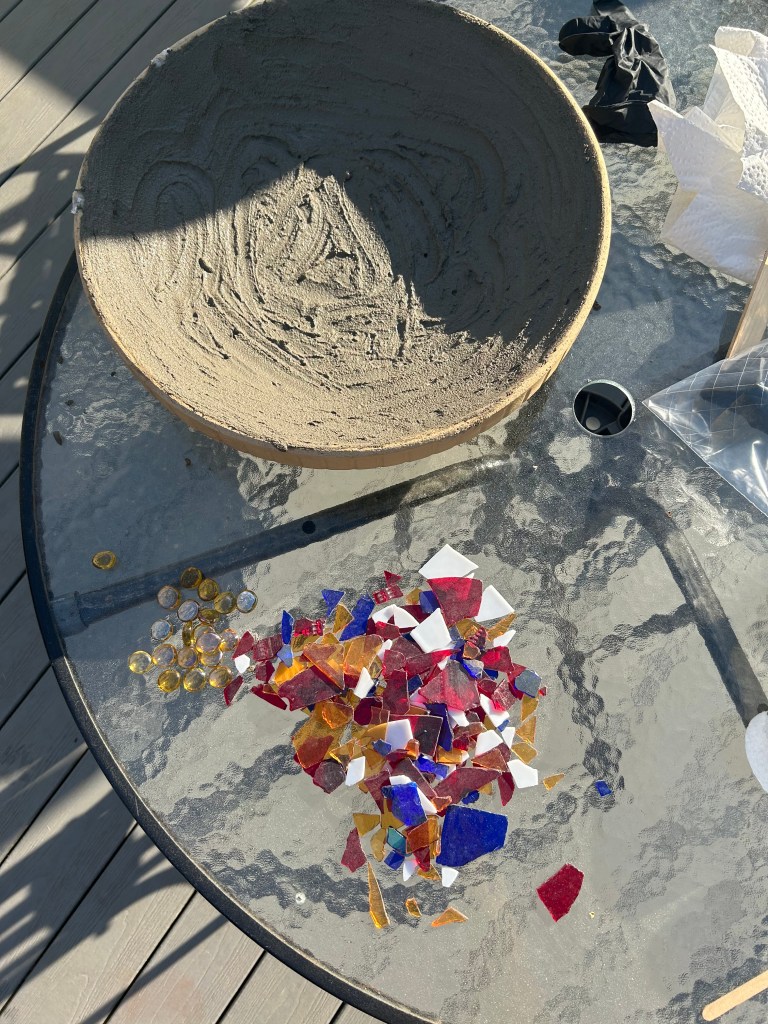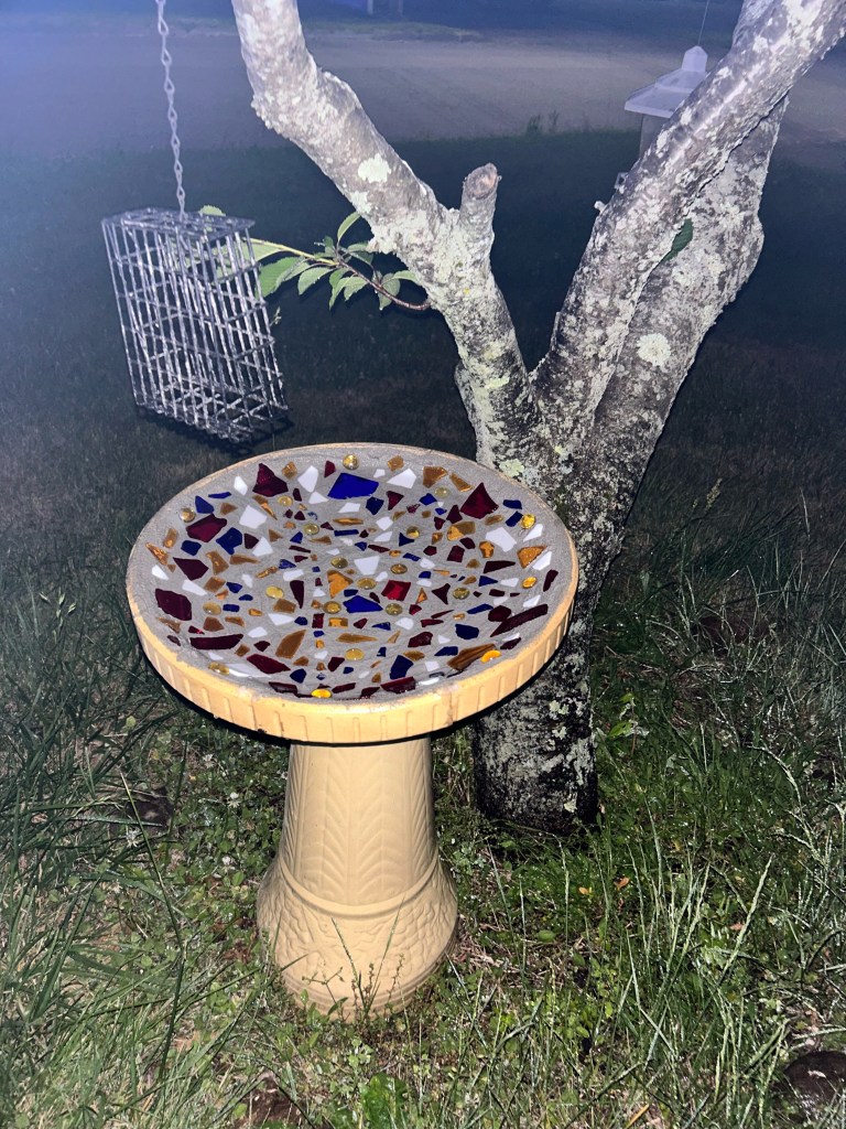 The next day, I spent several hours cleaning the living room and kitchen, before heading over to my mom’s house to take our dogs to the park and accomplish more errands. During this past week, Hubby has helped me to refurbish a broken bird bath with a mosaic tiling kit! I finally got it set up last night, and I think it turned out really well!