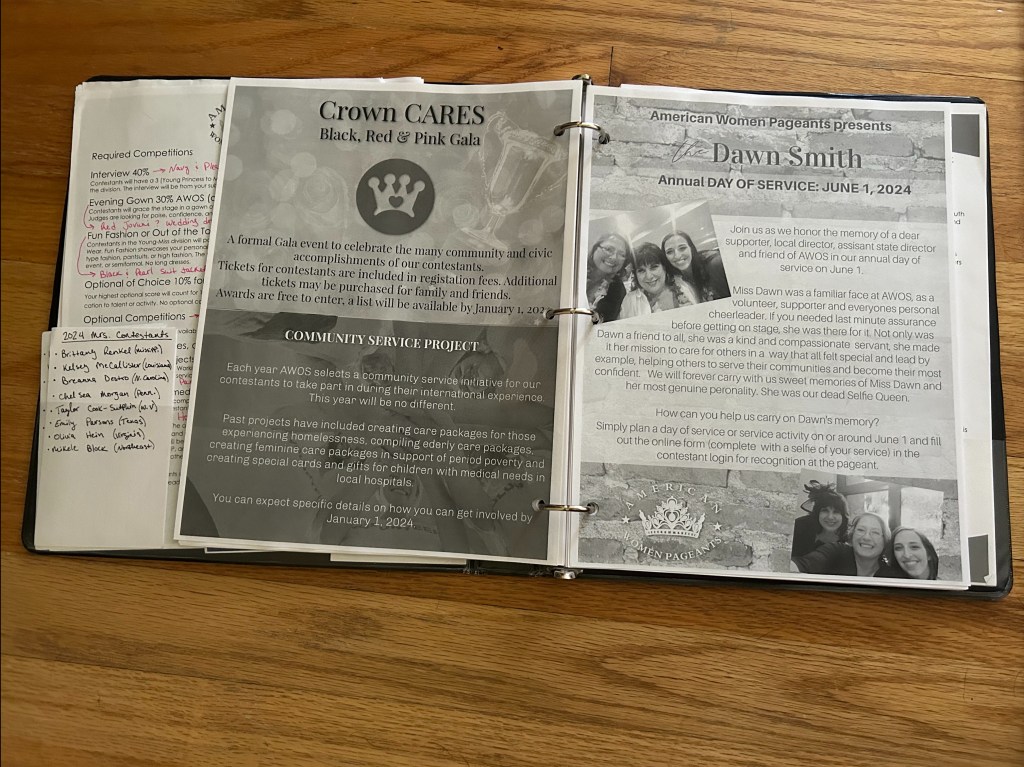 Ever since I started competing at 11 years old, I’ve liked to keep myself organized by creating my pageant binder. This is where I keep everything from the pageant’s rule book and expectations, an account of payments made and funds raised, the hours of community service I’ve logged, and my notes and plans for my competition wardrobe!
