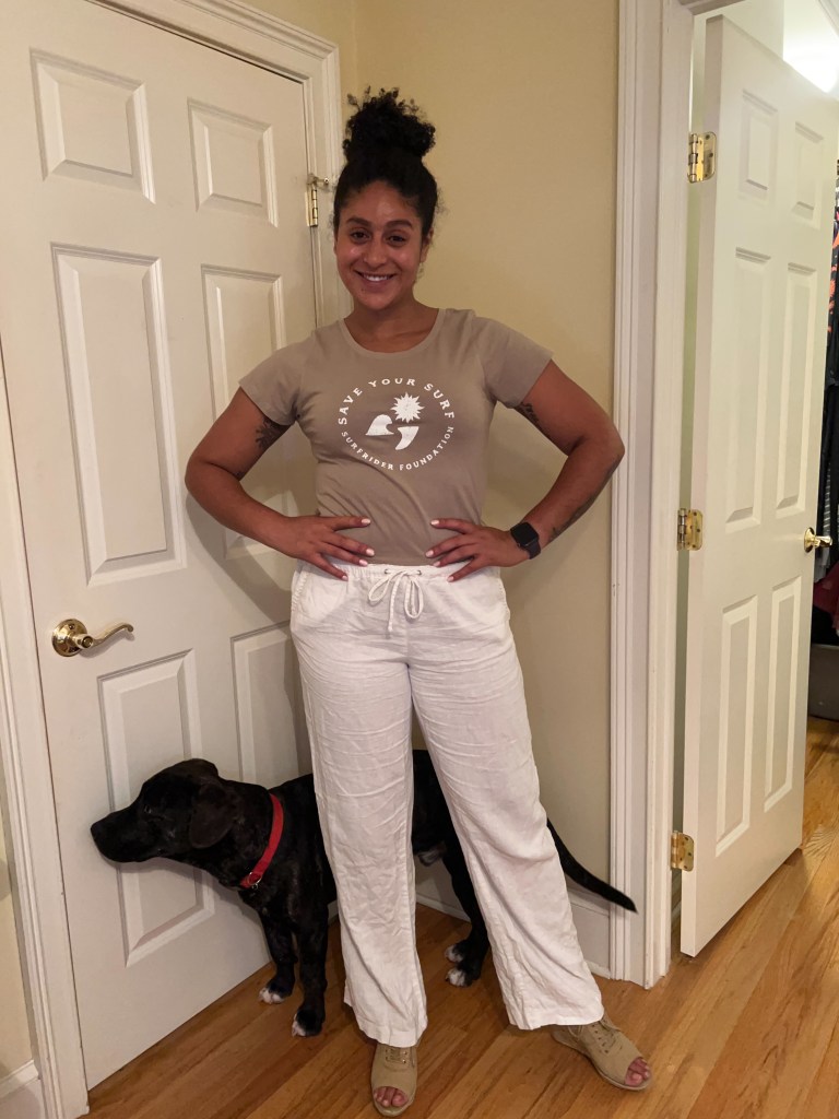 As an avid beginner surfer, I will be wearing my SurfRiders Foundation shirt paired with white linen trousers and khaki colored espadrille wedges. The SurfRider Foundation was founded by surfers, working tirelessly to keep our beaches and coastlines clean and safe for all who want to enjoy them!