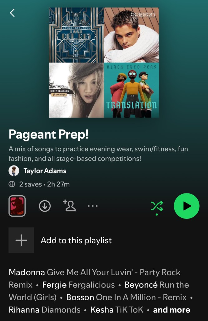 I also get my mind into the pageant headspace by listening to pageant-focused podcasts – such as the Pageant Planet Podcast and the Pageantry Magazine Podcast – and listening to the pageant-themed playlist I’ve made, featuring songs perfect for practicing your evening gown, modeling and swimwear walks!
