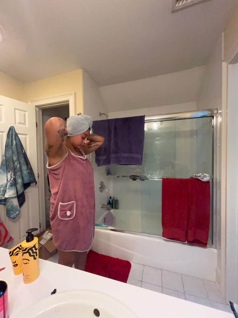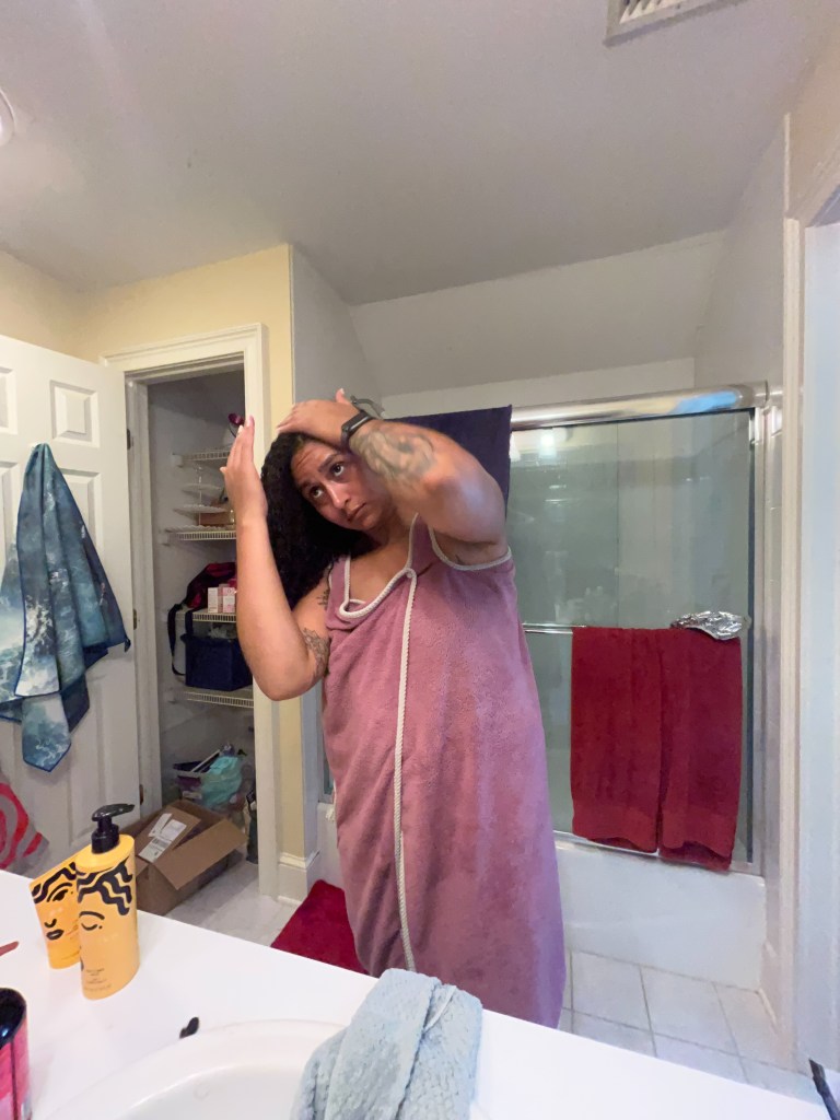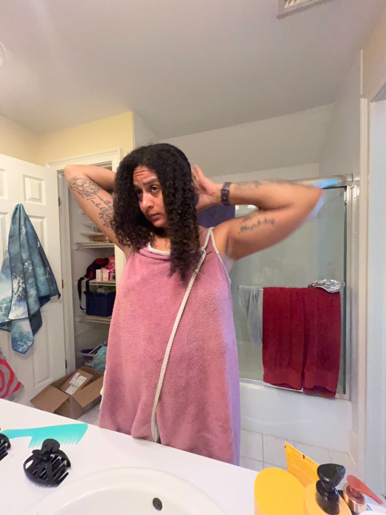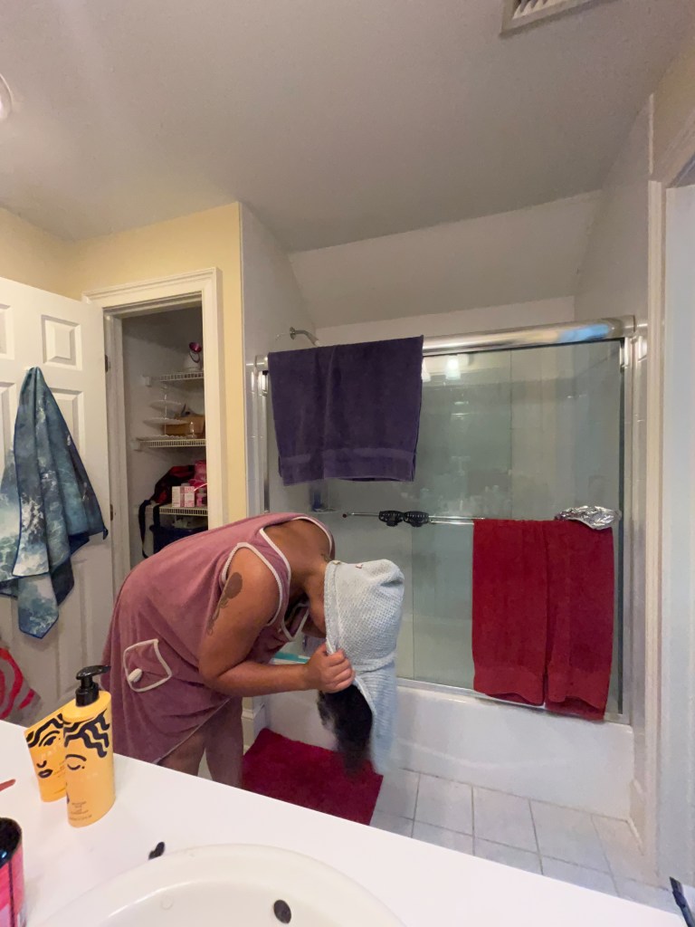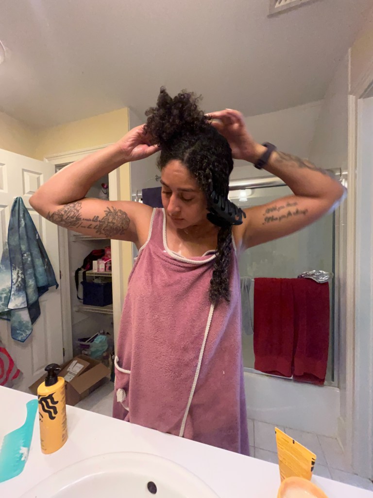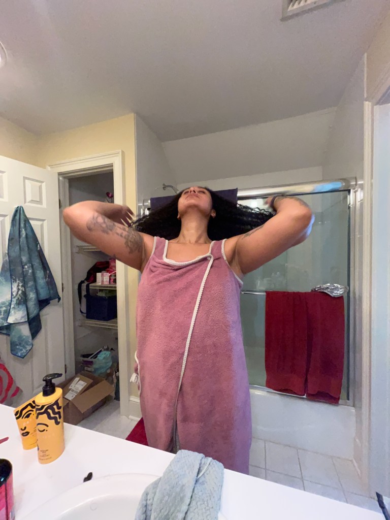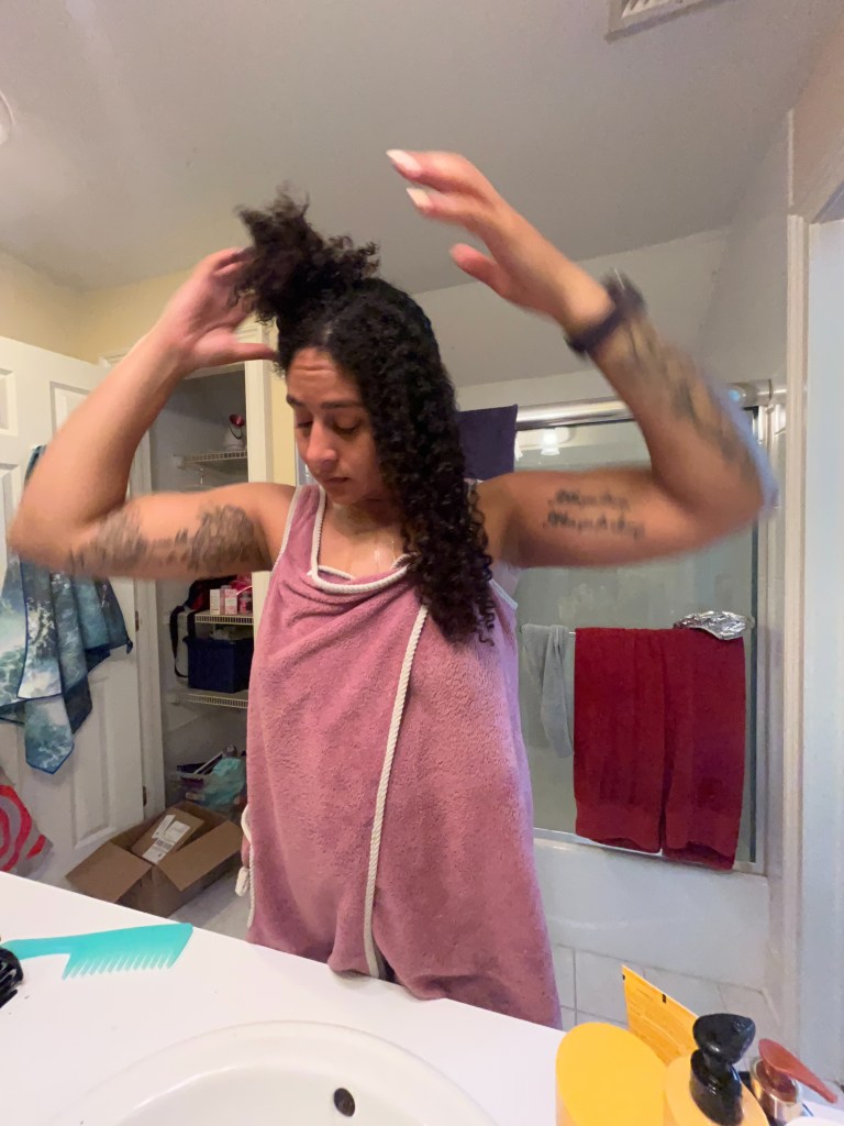 To complete the process, I’ll wrap my hair in a microfiber hair towel (or any other drying implement, an old t-shirt works really well!) in order to remove excess water. After at least an hour, I’ll remove the towel and allow my hair to air dry.
