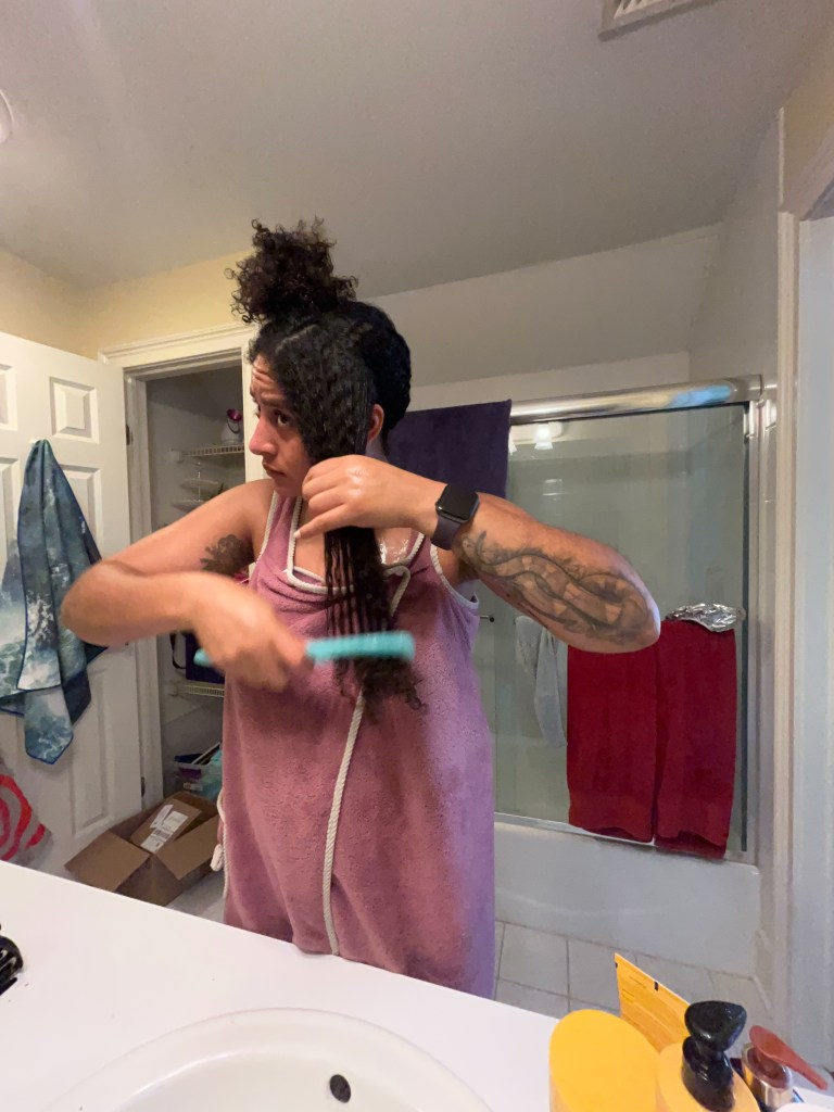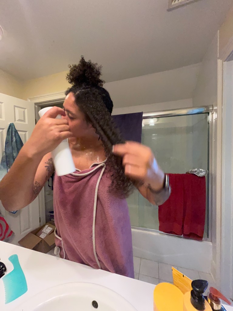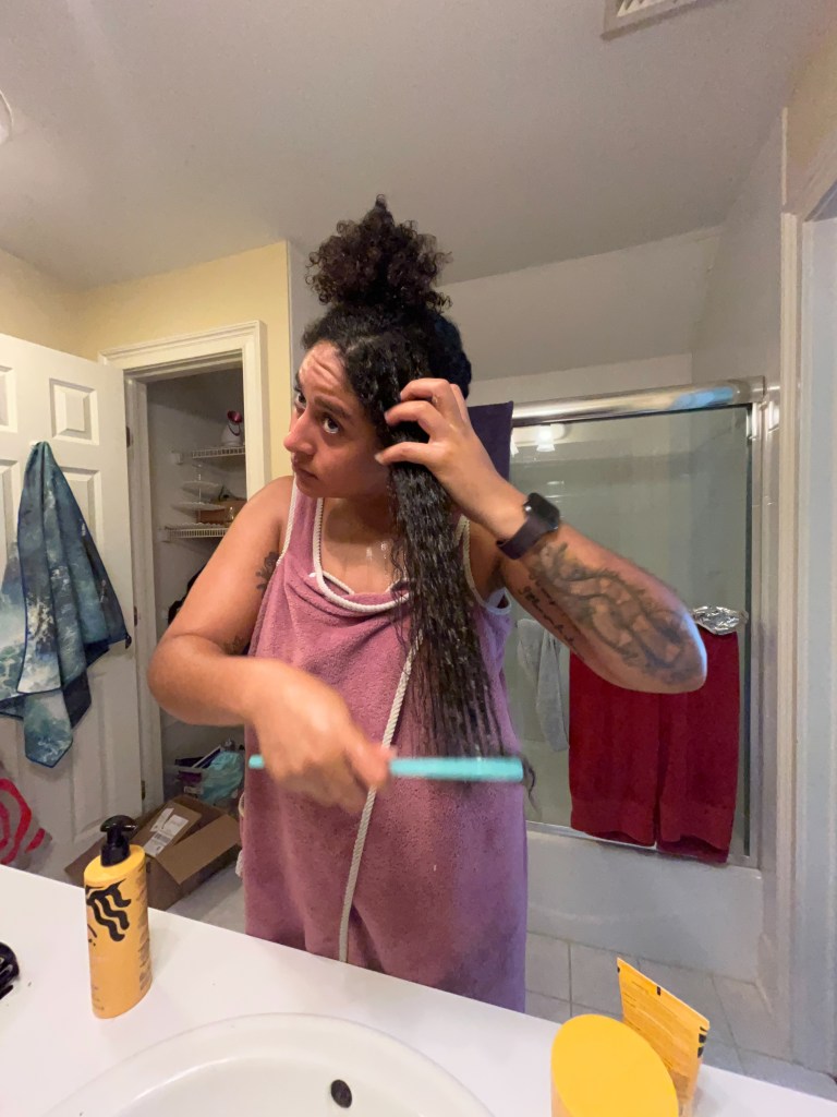 Once I have my first section, I’ll begin by spraying more water (if needed) and detangling the section using the wide tooth comb. Remember: more water = happier curls!