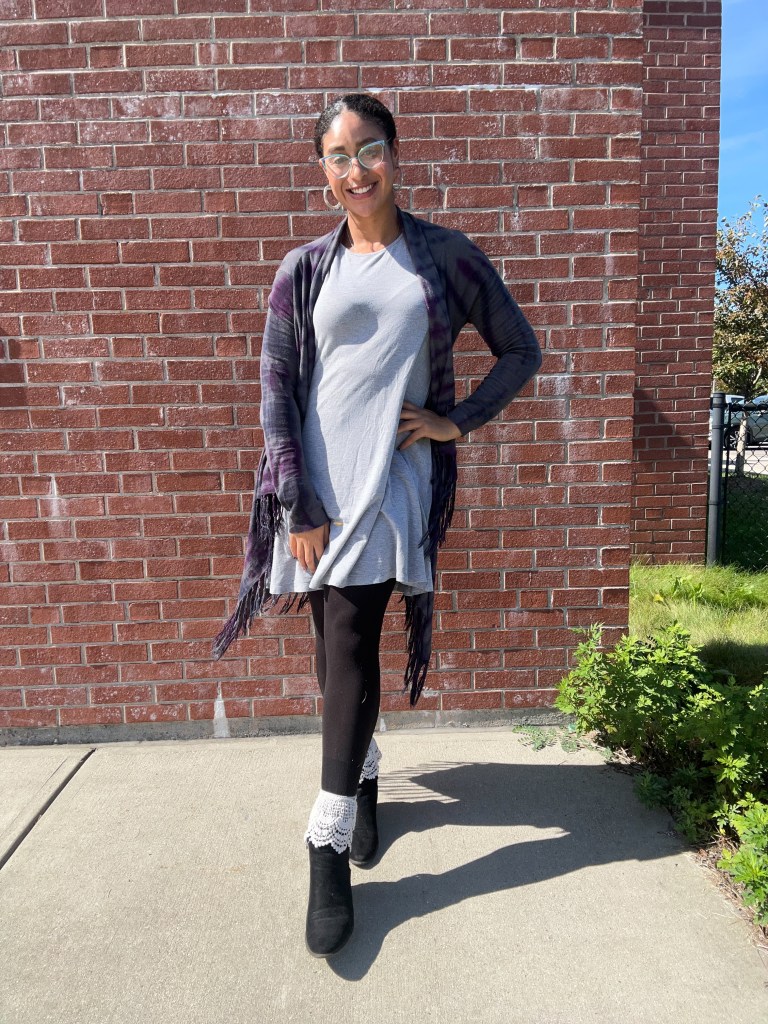 I paired them with a gray Old Navy brand t-shirt dress and a purple and gray tie-dye fringe cardigan. I slicked my hair back in a bun, and finished off the look with my blue Zenni Optical frames, a pair of silver mesh hoops, and the necklace I was gifted when I won my title!