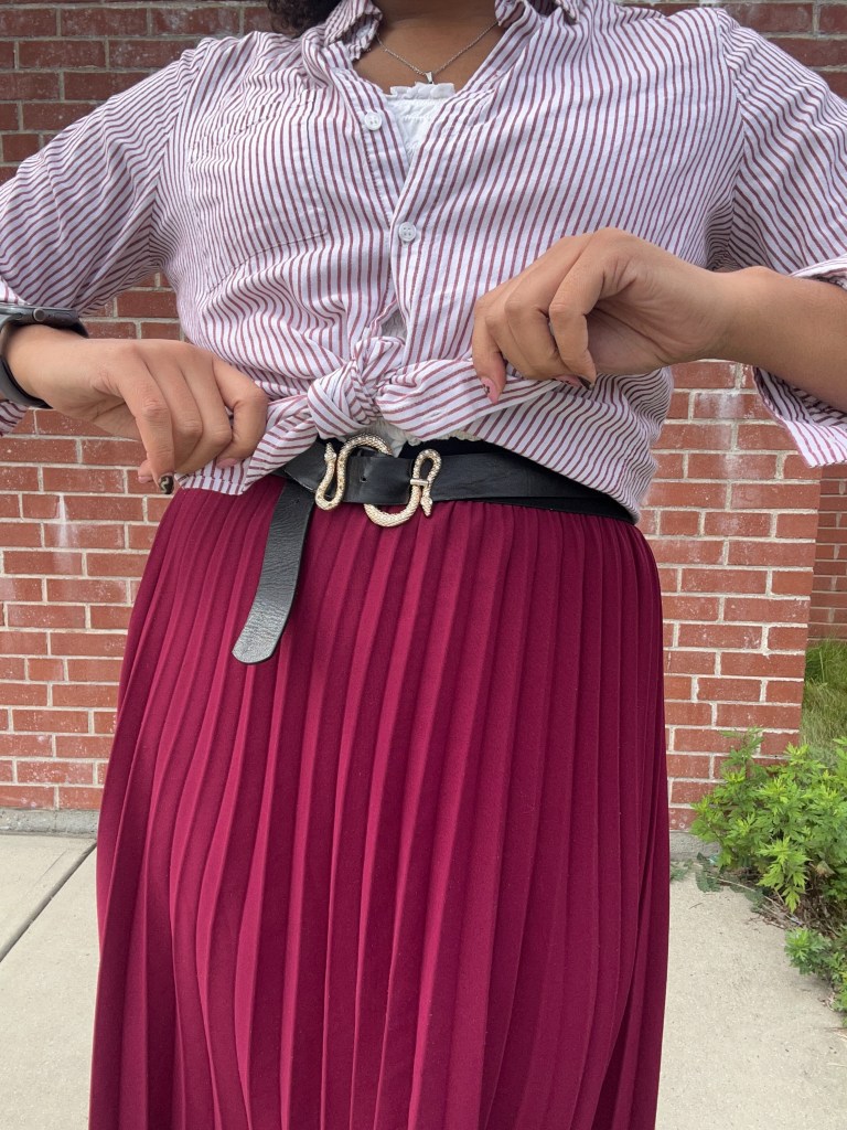 I went with a quasi-monotone outfit on Tuesday, picking a maroon SheIn skirt with a ribbed, cropped white tank top from American Eagle, under my maroon-and-white striped button down, which I tied at the waist. I finished off the look by adding the rhinestone snake belt and topped it off with my denim jacket for warmth (it’s from SheIn).