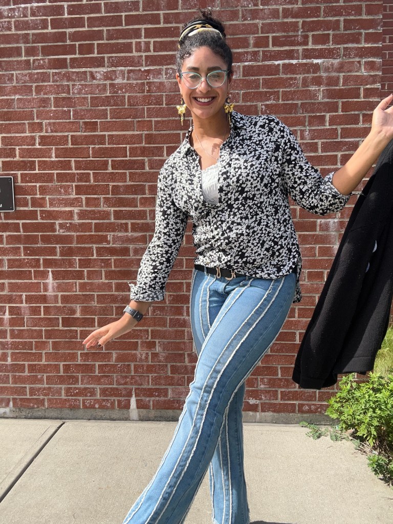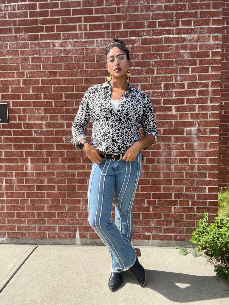 I paired the jeans with the same white cropped top I wore the day before, with black floral print button down which I French tucked, and the black moon phase cardigan from Hot Topic. Accessories included the rhinestone snake belt, the “peasant” shoes, a pair of gold butterfly earrings from Temu, and wrapped a black and gold scarf around my bun.