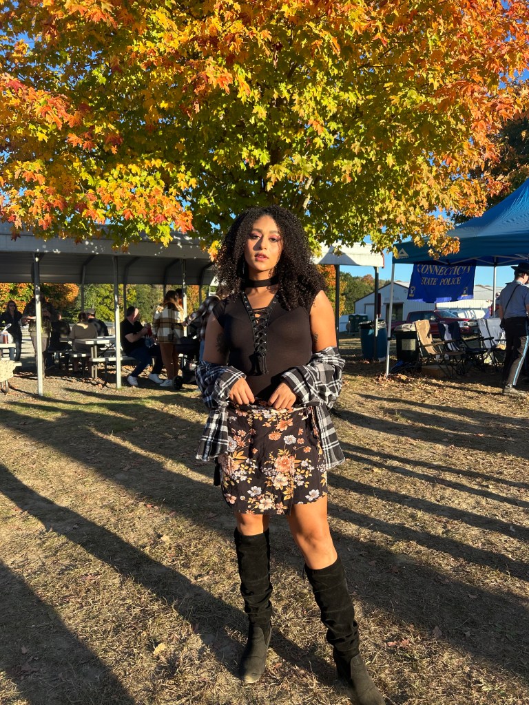 For my look I layered a bodysuit by the brand Iris beneath an American Eagle wrap skirt and my black and white flannel by Merona, bought at Target! To finish off the look I wore a pair of over-the-knee black suede boots from Temu. Accessories included the mini star earrings from Temu, a dagger shaped stud earring from Zara, a rhinestone drop earring from Forever 21, and a set of skeleton butterflies earrings from Temu!