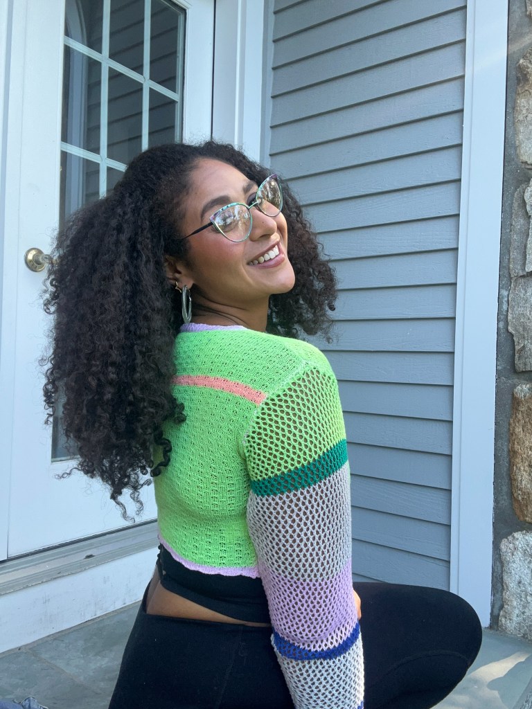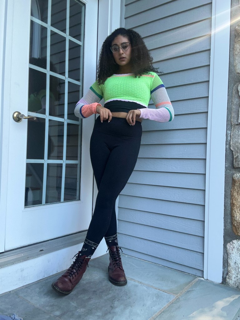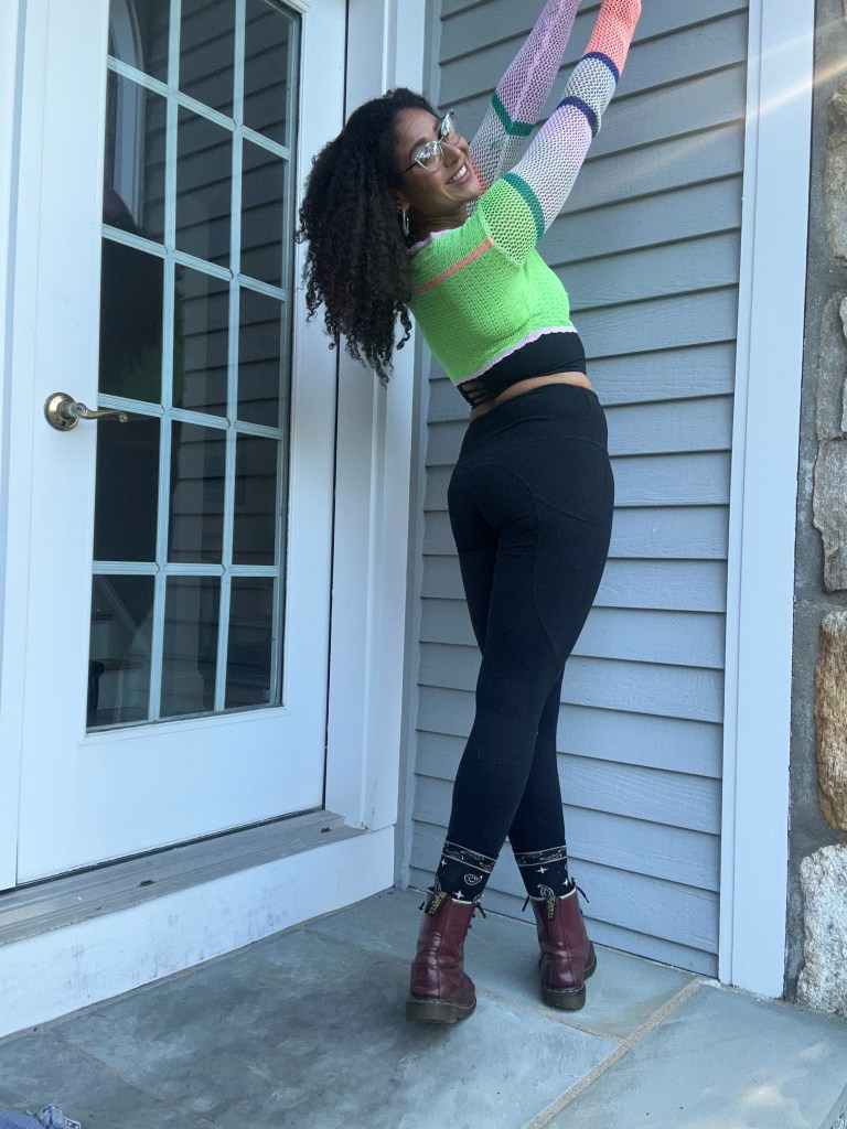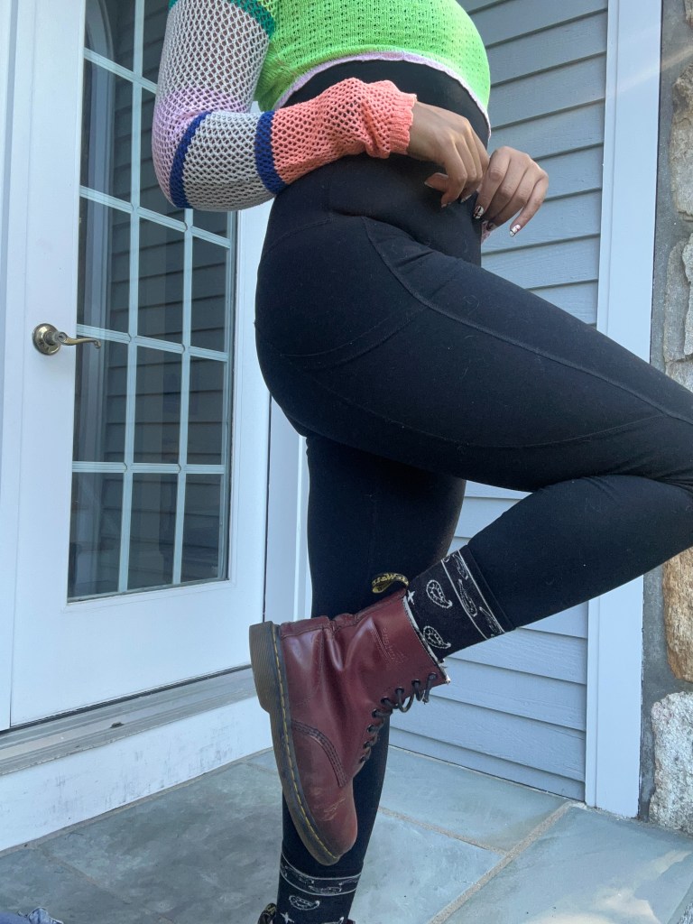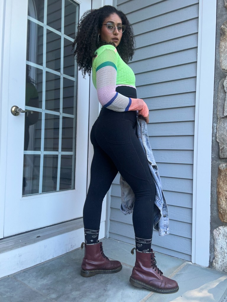 I kept my outfit simple and comfortable by wearing my 90 Degrees by Reflex leggings (found on Amazon!) with a pair of black socks to keep the leggings tucked into my Doc Martens. On the top, I paired my Astoria LUXE BALANCE Sports Crop (you can save 15% off all your Astoria orders with code ‘WATS15’!) with a cropped knit sweater from SheIn and my denim jacket on top, also from SheIn!
