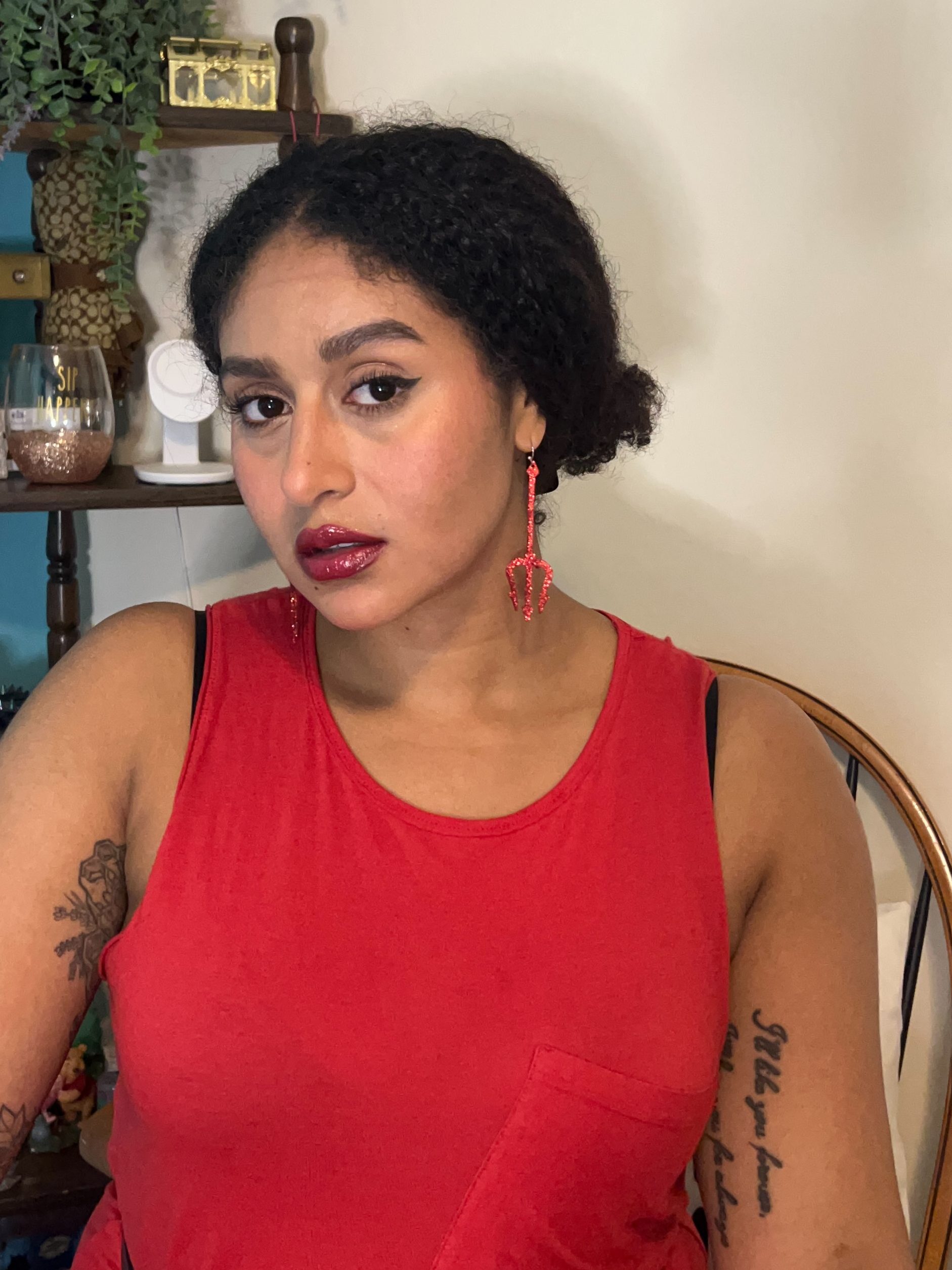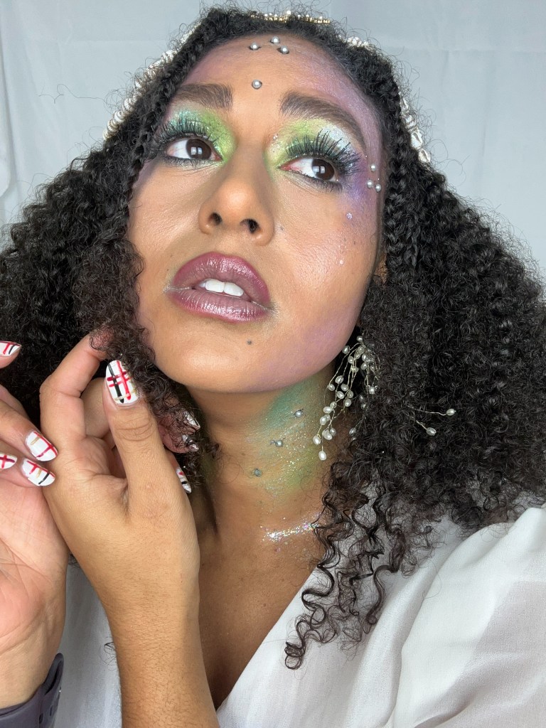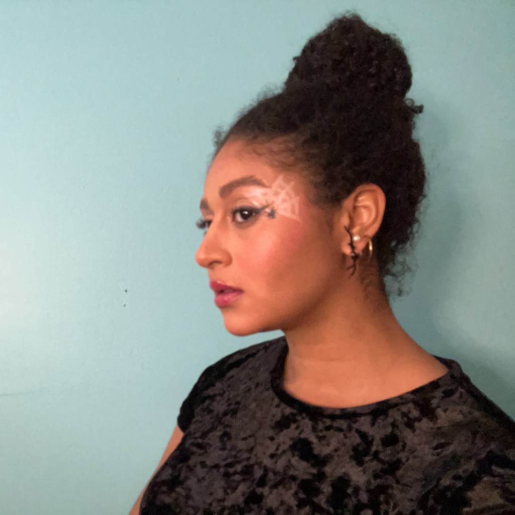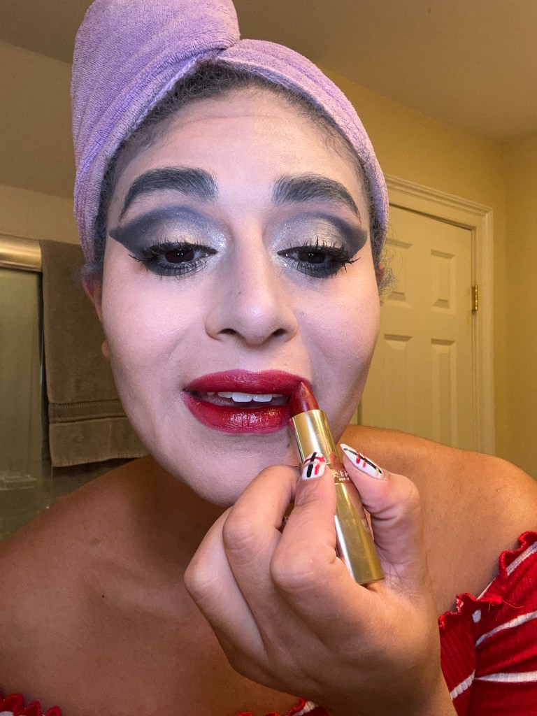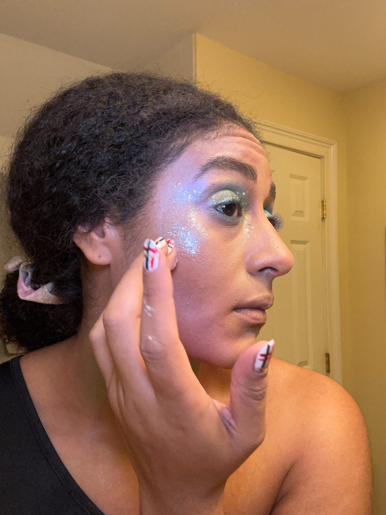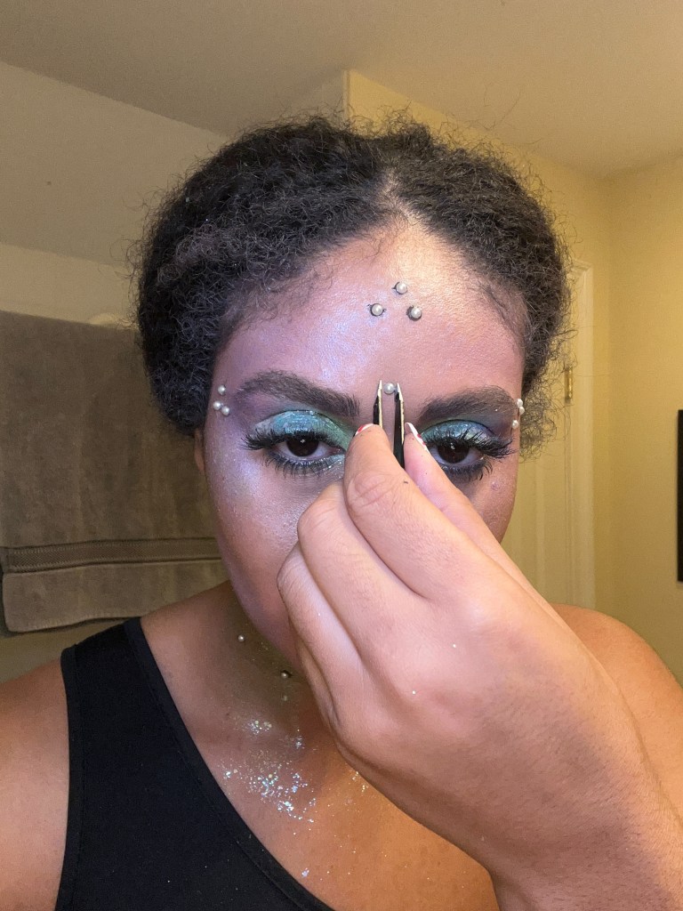 I started this eye look by laying down a base of the LA girl liquid shadow on the center of eyes, went over that with Malibu shade Follow The Sun, and applied a set of Ardell 174 lashes with Duo brand stiplash adhesive in Dark Tone. And, to finish off the eye I applied L’Oreal Voluminous mascara to adhere lashes to fake lashes. The real standout of this look are the rhinestones I applied around the eyes! These are attached using the same lash glue and six large “Recollections Bling Stickers” rhinestones around the purple eye shape.