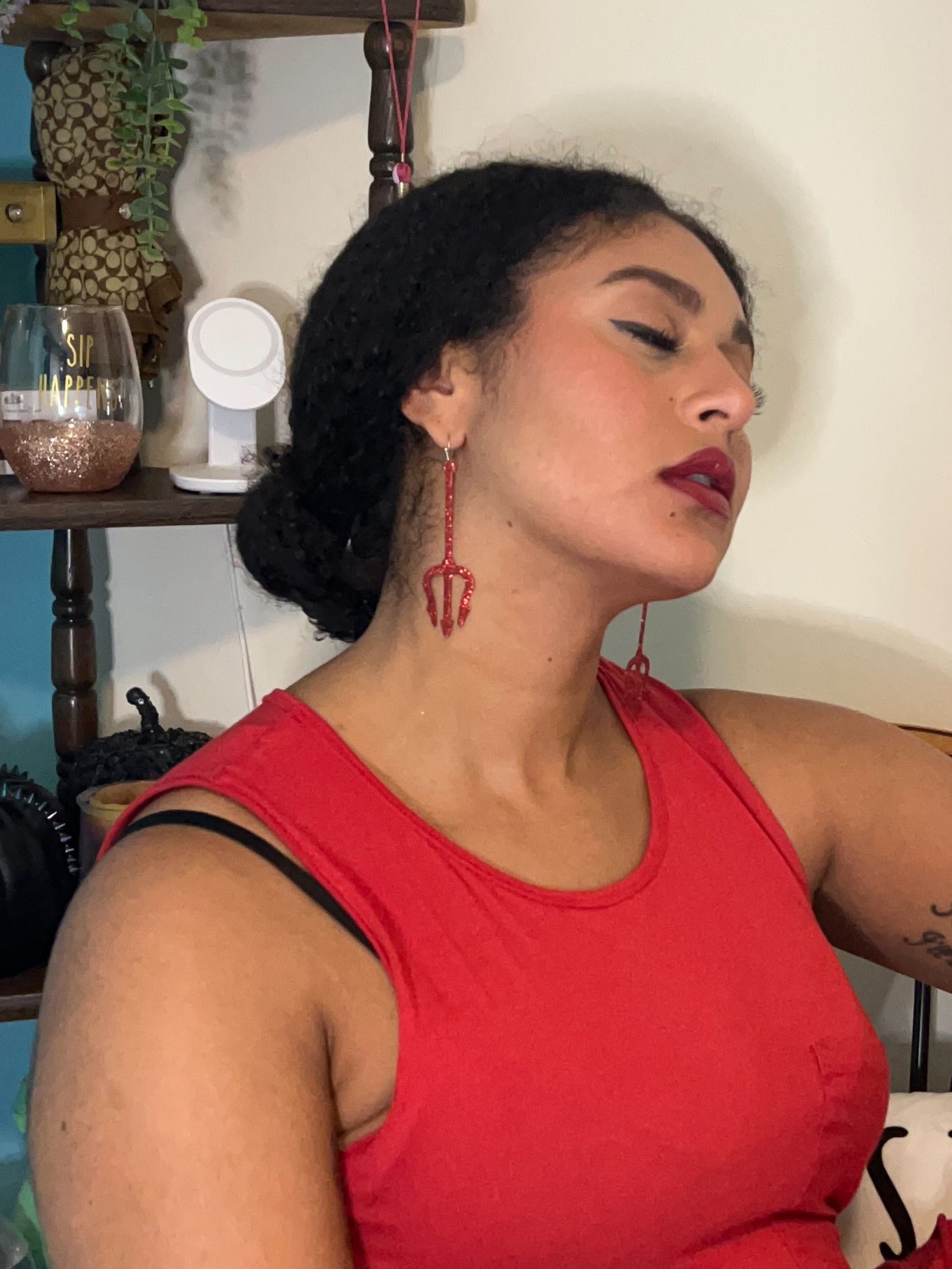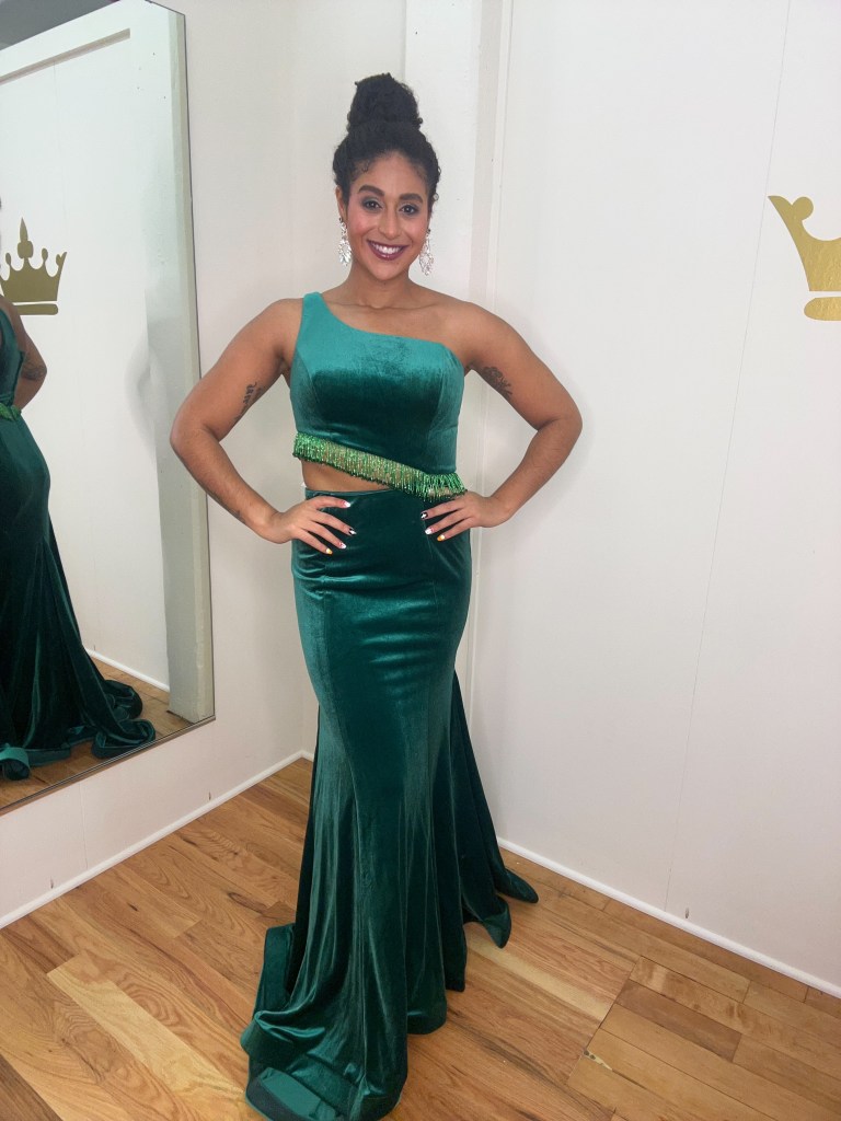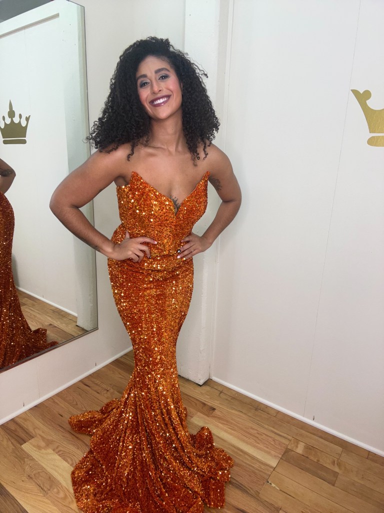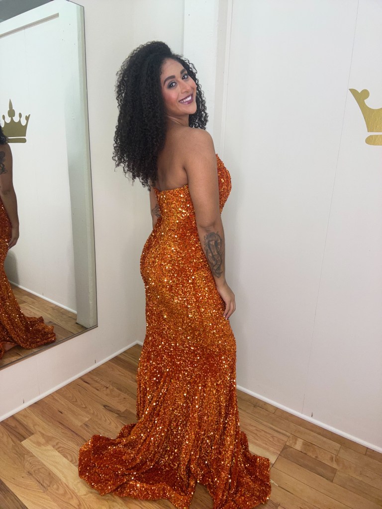 As soon as beloved Dazzle employee, Emily, pulled this burnt orange, Portia + Scarlett off the rack I knew I would be channeling Moana! This gown is also velvet – one of my favorite fabrics ever! – and features sequins that reflect hues of gold! I left my hair down and full, choosing to forego earrings and let the gown speak for itself!