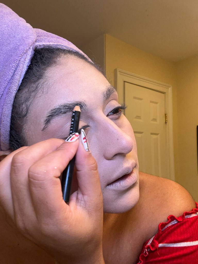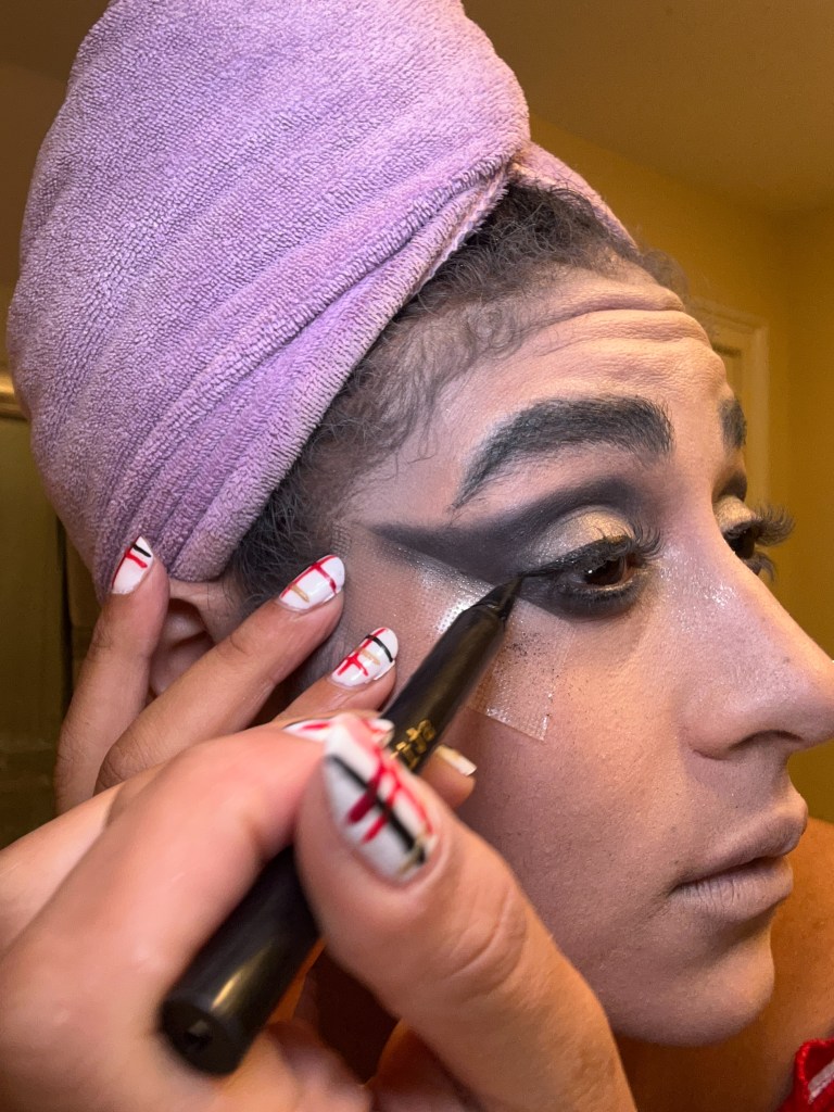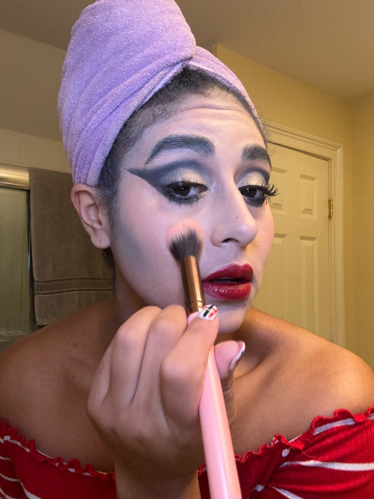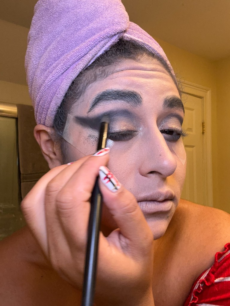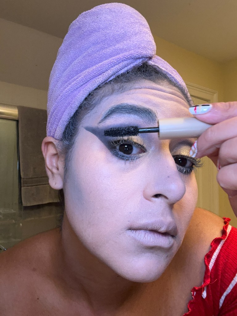 To create Morticia’s iconic and timeless look, I needed to create a flawless base – one that even a vampire would be envious of – to do so I started with the Sephora brand primer, color corrected under my eyes and around my nose with the L.A. Girl Pro Conceal HD concealer in shade orange corrector, and concealed that using the Tarte Shape Tape in shade light-medium sand. I crafted her gothic visage using a sample of the Too Faced Born This Way Multi-Use Sculpting Concealer in shade Swan, and set all of this with the Sephora brand setting powder.
