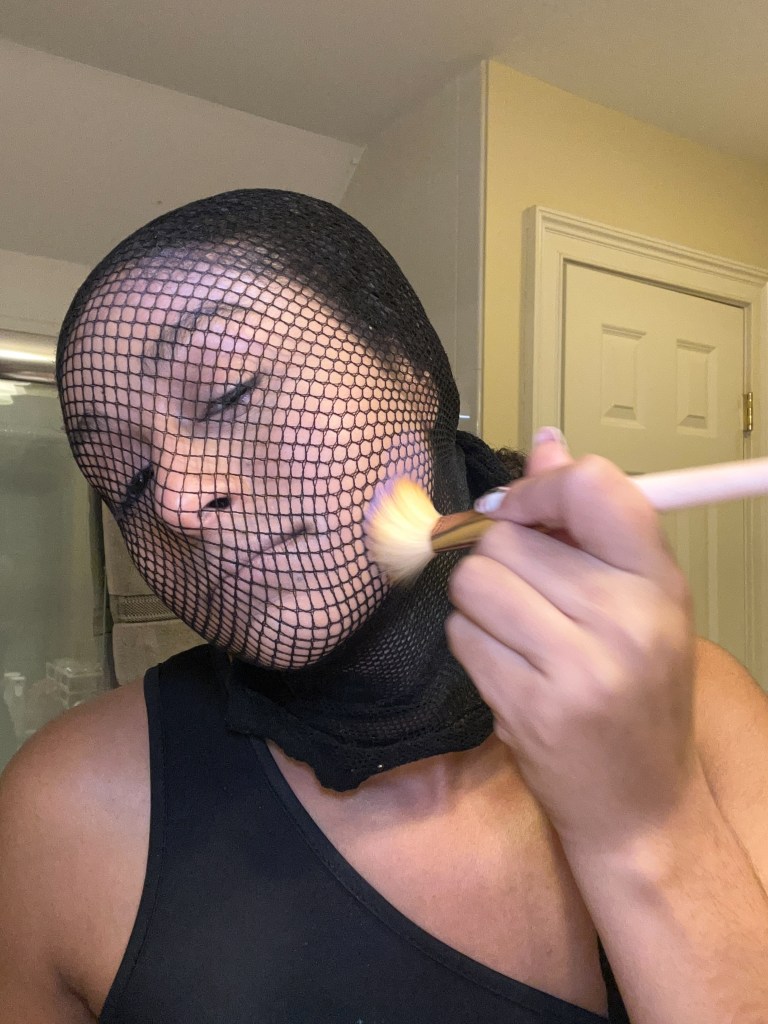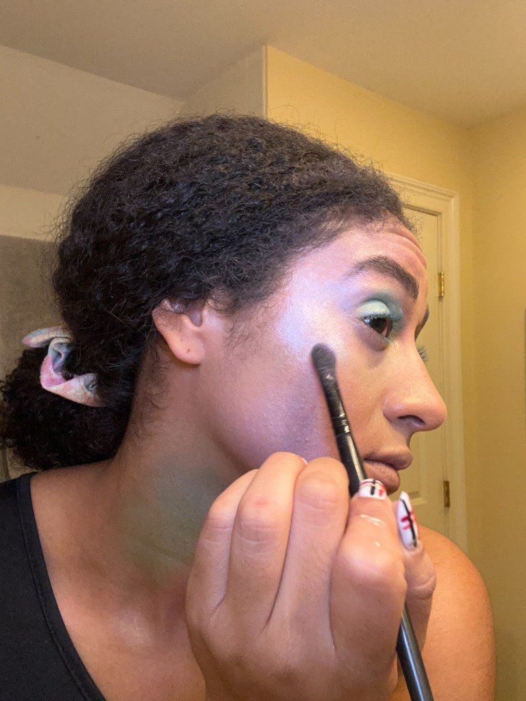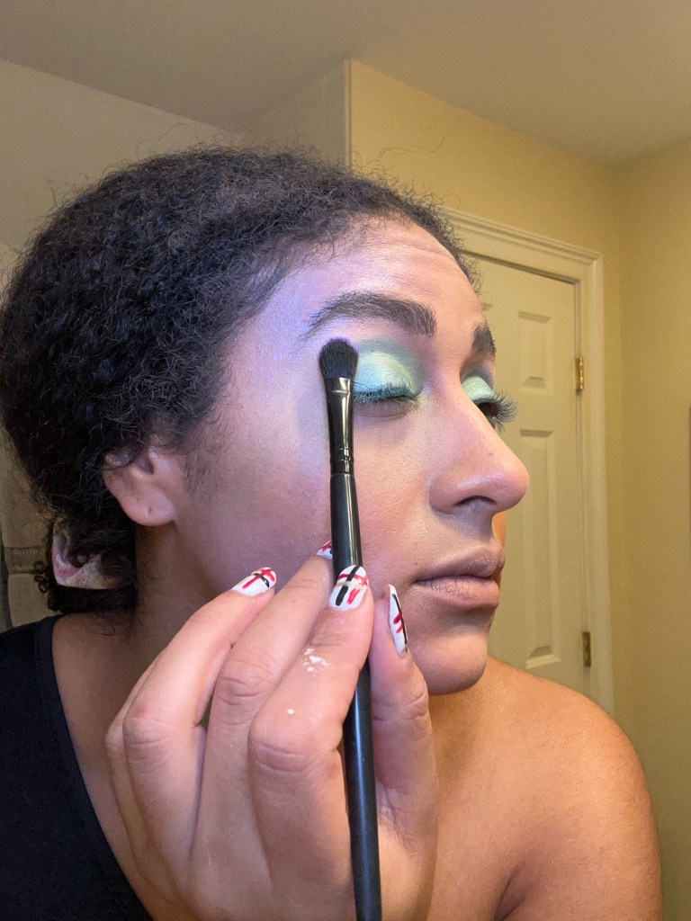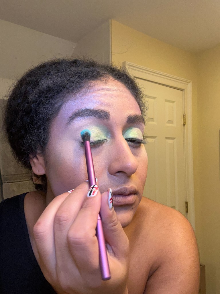 I crafted this mermaid look by starting with my standard makeup base. With my base makeup in place, I immediately went into adding the scales by putting a pair of my fishnet tights over my head and pulling them down onto my neck. This gave me an intense bout of claustrophobia and in the future, I will be purchasing a new set of fishnets that I can cut into pieces! For the scales on my neck I opted for two shadows in The Zulu by Juvia’s palette, the shimmer shades of blue and green. To add the scales along my hairline and jaw, I used The Violets by Juvia’s and the darkest purple and the lightest shimmer shade.