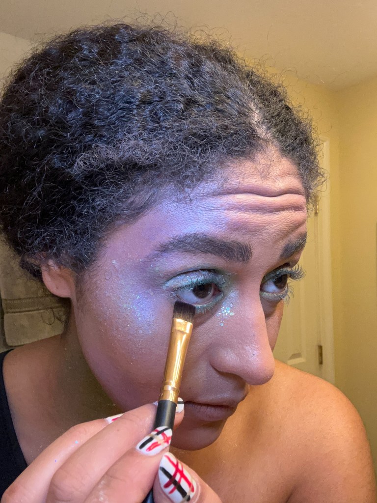 Once you’ve built up your shadow shades, you’ll want a small, flat packing brush to apply concealer on the lid which you’ll set with translucent setting powder. Now, you can use a super bright and sparkly shadow shade, but I chose to use the L.A. Girl Dream Glitter Liquid eyeshadow I’ve been using to create my sparkly winged liner looks. Bring these shadows down along the lower lash line and finish off with mascara. For lips, I used the ColourPop Star Wars lipstick in shade Supreme Leader.