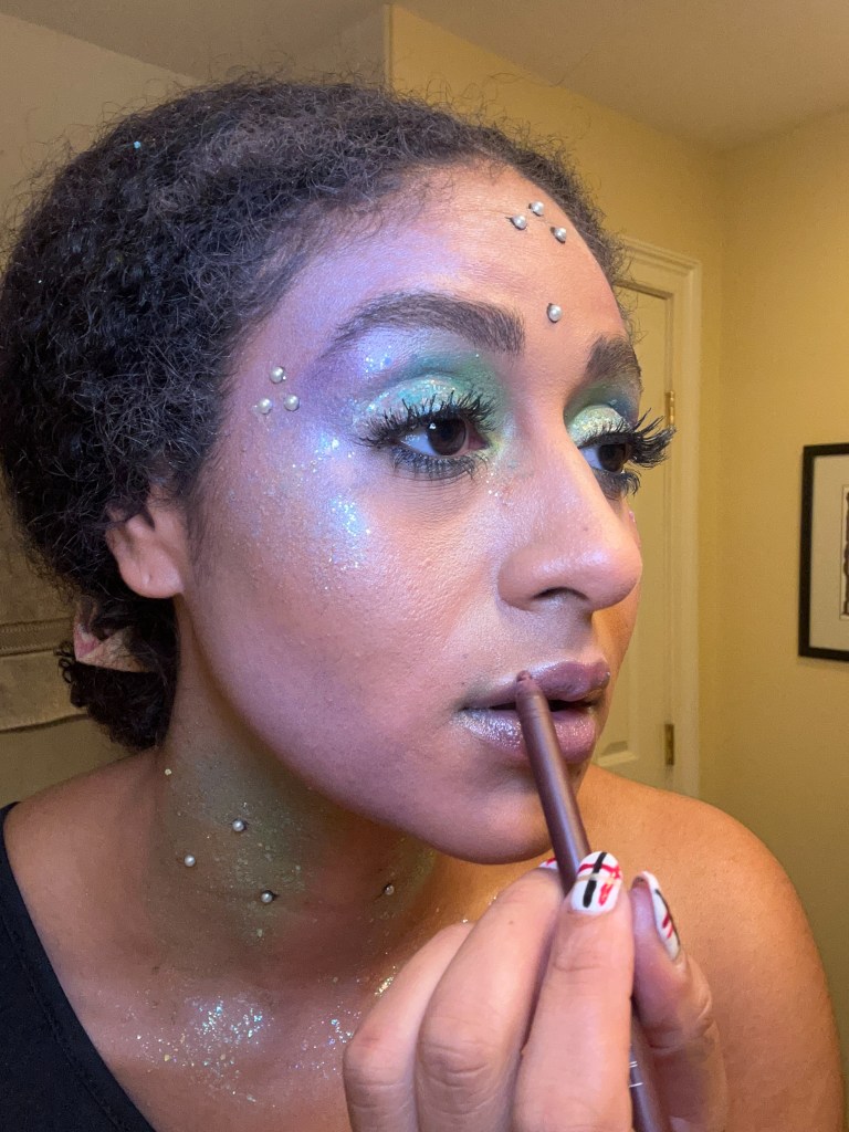 Next we’ll be applying our accent products – the Sailor Moon x ColourPop Glitterally Obsessed Glitter Gel in shade Moon Prism Power (over the eyeshadow, cheekbones, and neck scales), and the pearl accents, using the same technique (and brand) as the rhinestones in the clown look. Then I finished off the look by lining my lips with the Huda Beauty Lip Contour 2.0 in shade Very Berry and the Jovani gloss in shade Blush.