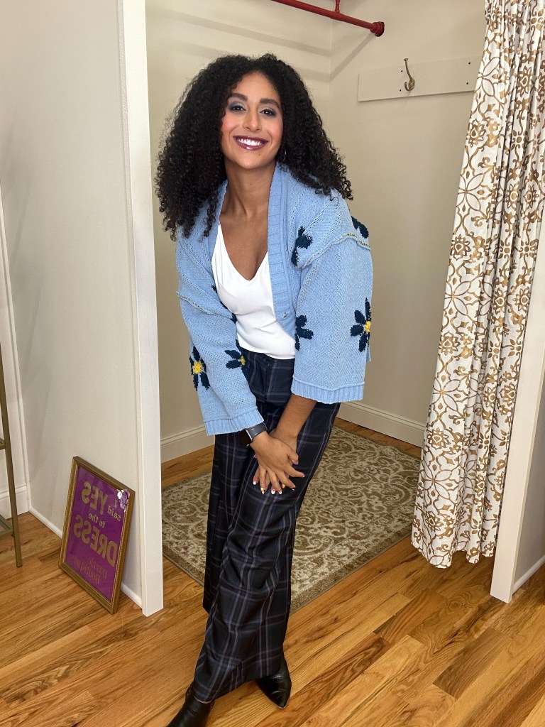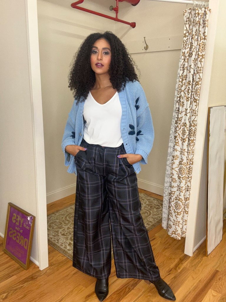 For my take on Mia’s school uniform I left my hair down and wild and selected a powder blue and floral print knit cardigan by the brand “Pol”, a pair of wide leg blue plaid trousers by the brand “Fore”, and a simple white tank top from the brand “CS”. All of these items are from the Dazzle Boutique inventory!