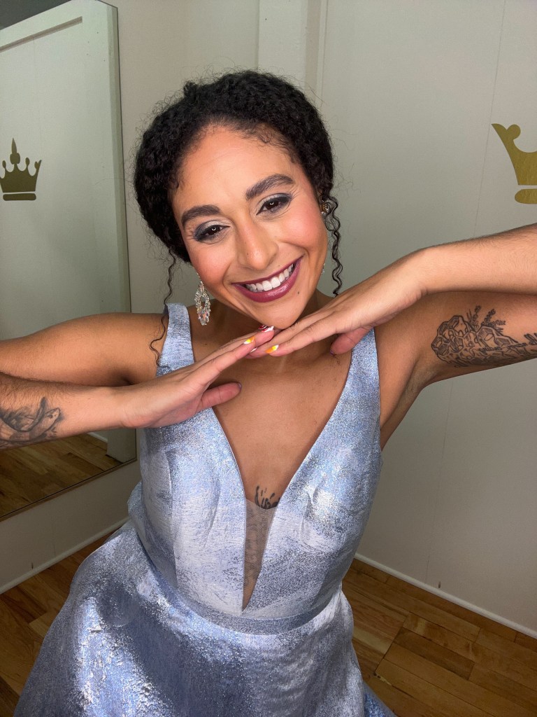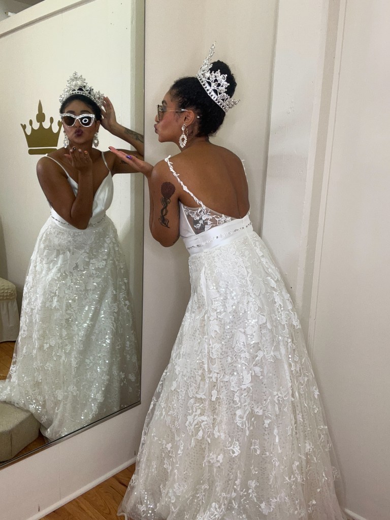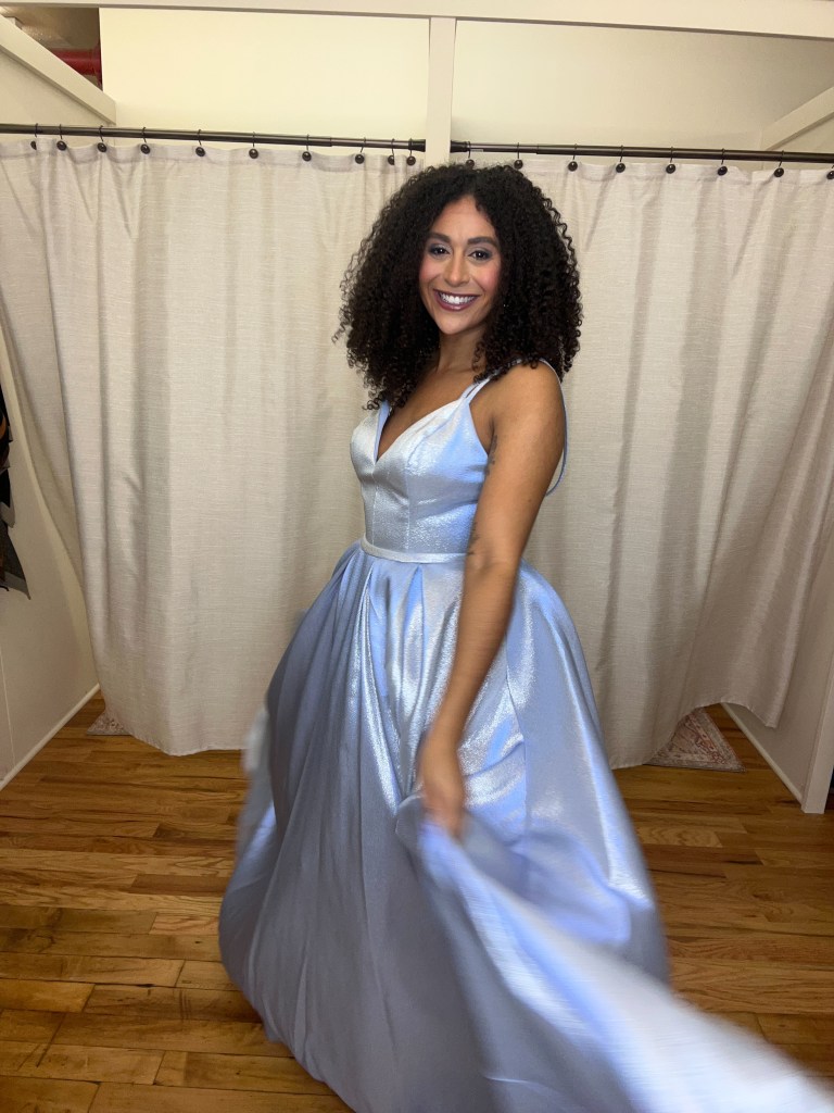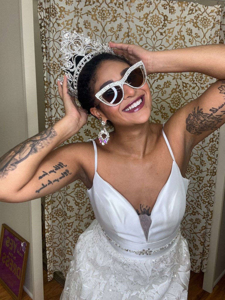 Once I transformed into the Princess of Genovia, I pulled my hair back into a big bun, added my rhinestoned Temu sunglasses, and finished off the look with my I.A.W.P. crown! Nothing could complete this look quite like the iconic ballgown – and the Dazzle team helped me select this beautiful Ellie Wilde Mon Cheri gown!