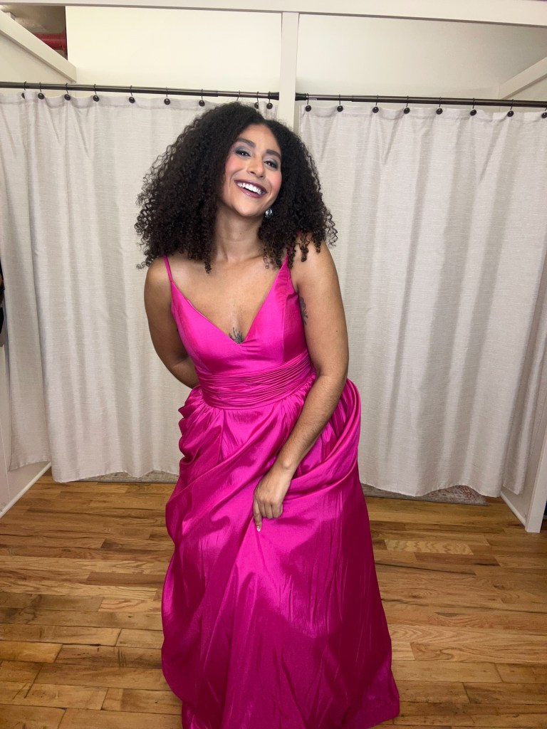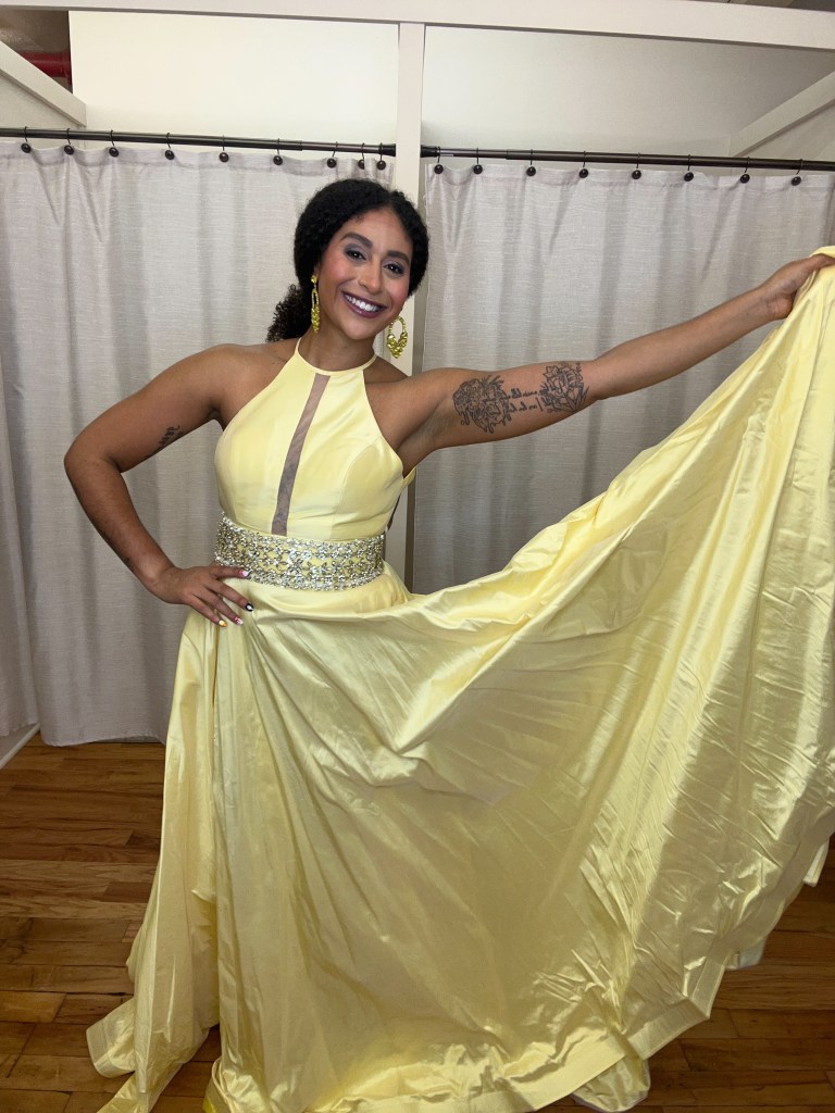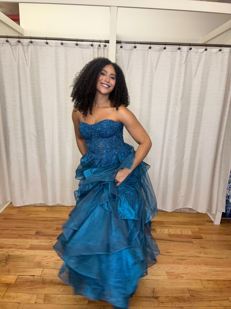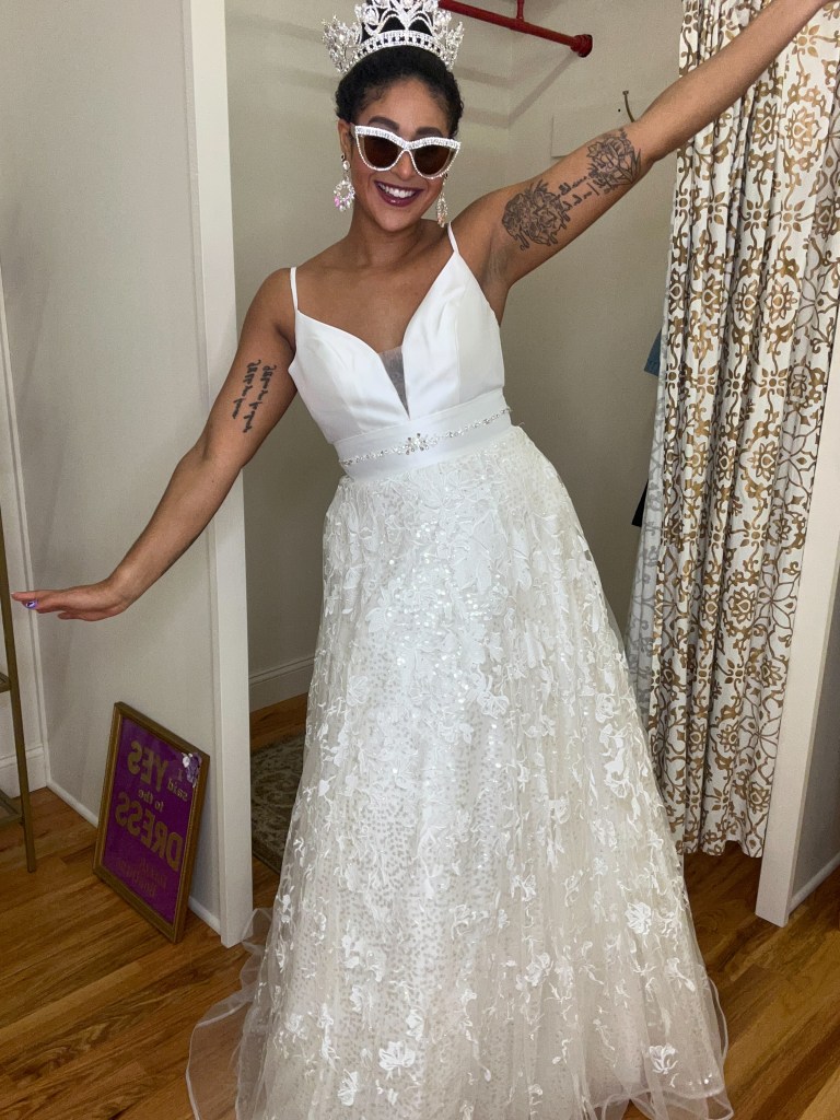 Once I transformed into the Princess of Genovia, I pulled my hair back into a big bun, added my rhinestoned Temu sunglasses, and finished off the look with my I.A.W.P. crown! Nothing could complete this look quite like the iconic ballgown – and the Dazzle team helped me select this beautiful Ellie Wilde Mon Cheri gown!