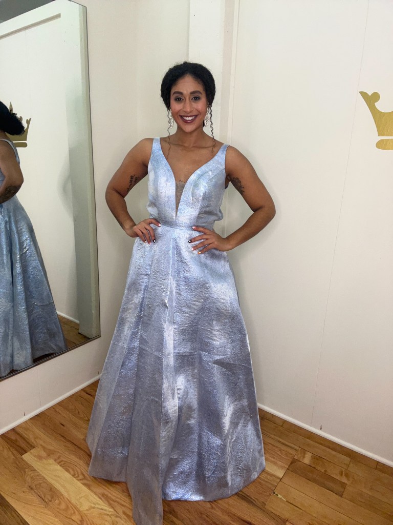 And to finish out my rotation, Emily helped me find this beautiful ballgown that has pockets, inspired by one of the most iconic princesses of all time – Cinderella! This Colette by Daphne Mon Cheri gown is the perfect shade of powder blue, and features silver floral embroidery that really sparkles as it catches the light! I pulled my hair back into a low bun and left some tendrils loose, opting for the same rhinestone earrings as my Tiana look. (I would be remiss if I didn’t try to recreate the lost shoe scene!)