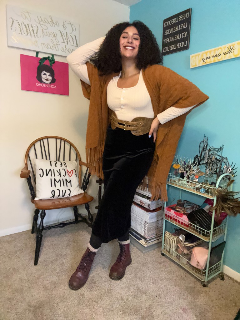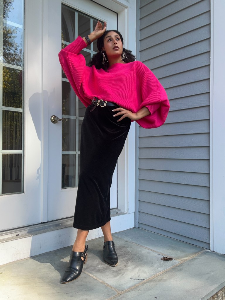 If my outfit is monochromatic (all one color, such as black) then I may choose to wear this velvet skirt with a black cotton bodysuit, a black leather belt, black suede booties, and either a black blazer or a black cashmere cardigan.