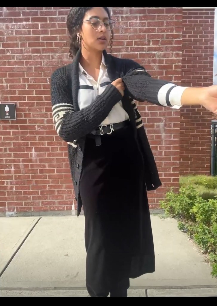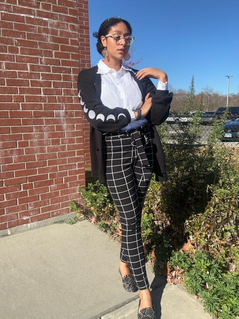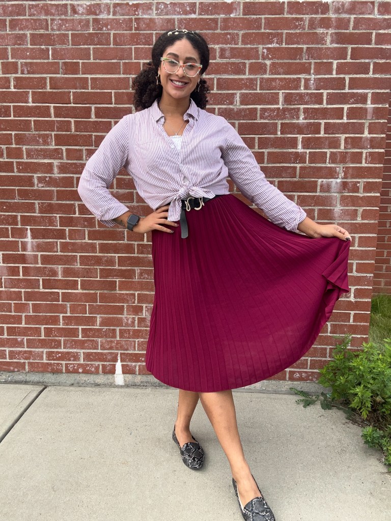 I have worked in many different settings, but I currently work in a high school. My rule of thumb for personalizing business wear is layers! Recently I’ve enjoyed layering a bodycon dress under a midi length skirt, adding a belt at my waist, and finishing off with a cardigan and booties!