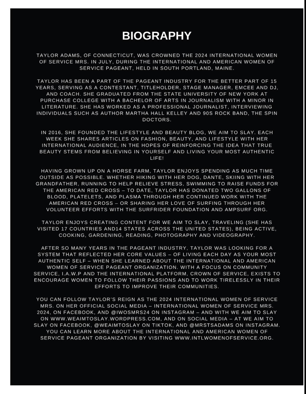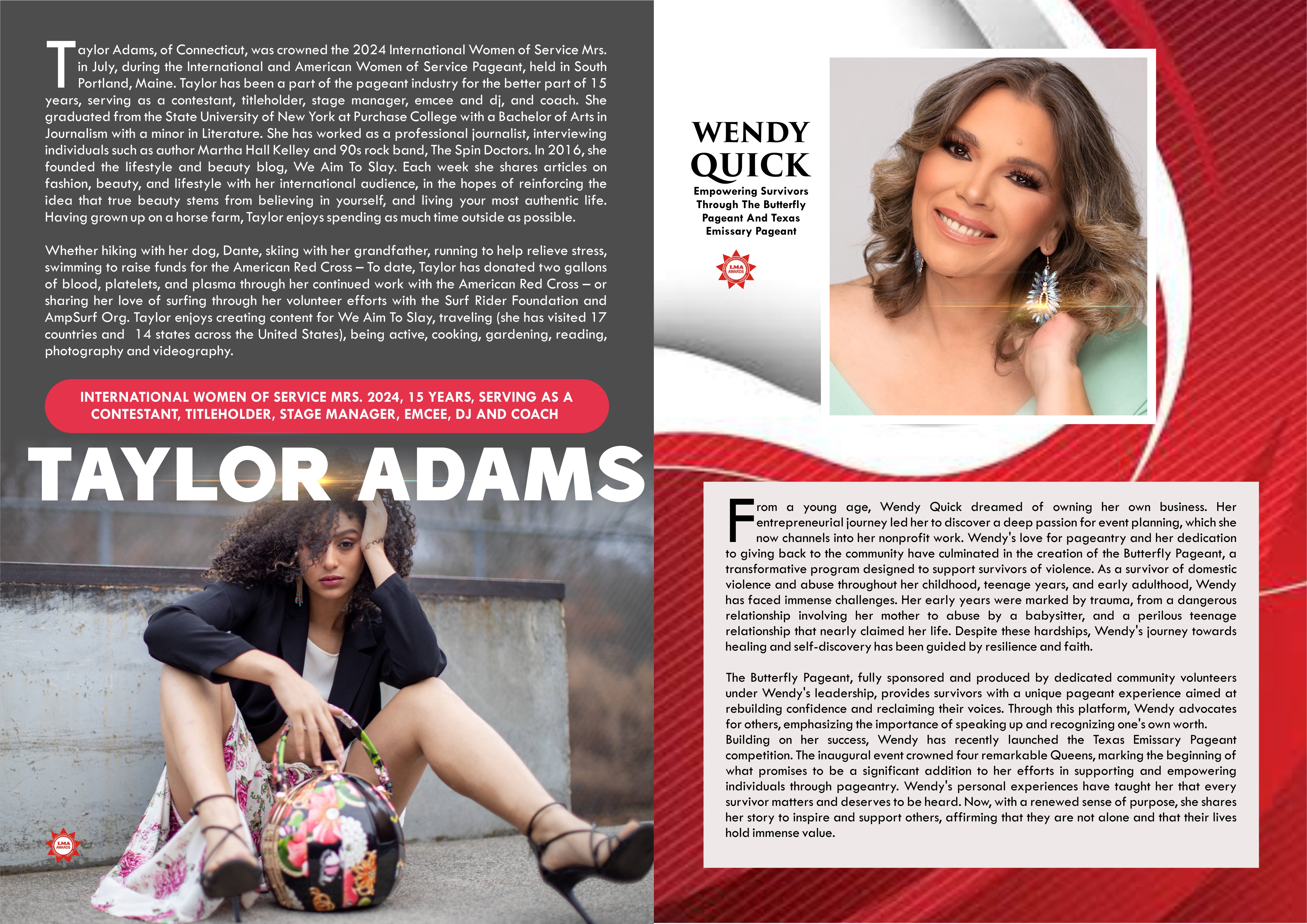 Although I am deeply honored to have been featured in these publications, I did resign my title of International Women of Service Mrs 2024, effective Monday, Nov. 25, 2024. While I am no longer a reigning titleholder, I look forward to my next opportunity to represent my hometown, state, and the organizations close to my heart!
