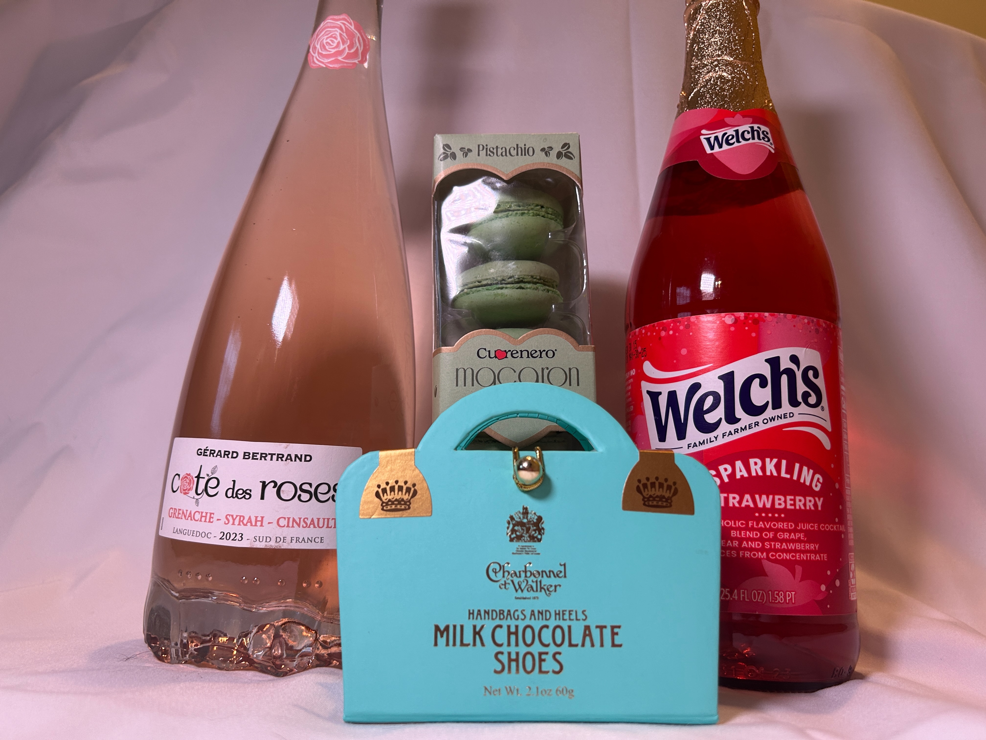 Nothing says self care like a sweet treat! This year I’m indulging with one of my favorites, pistachio macarons! I also found the cutest set of chocolates at HomeGoods, the Charbonnel et Walker Handbags and Heels Milk Chocolate Shoes. In sticking with the Valentine’s Day theme, I opted for sparkling pink beverages – the Cote des Roses rose for those who enjoy an adult beverage, and the Welch’s Sparkling Strawberry non-alcoholic juice cocktail for those of us who’d prefer to abstain!