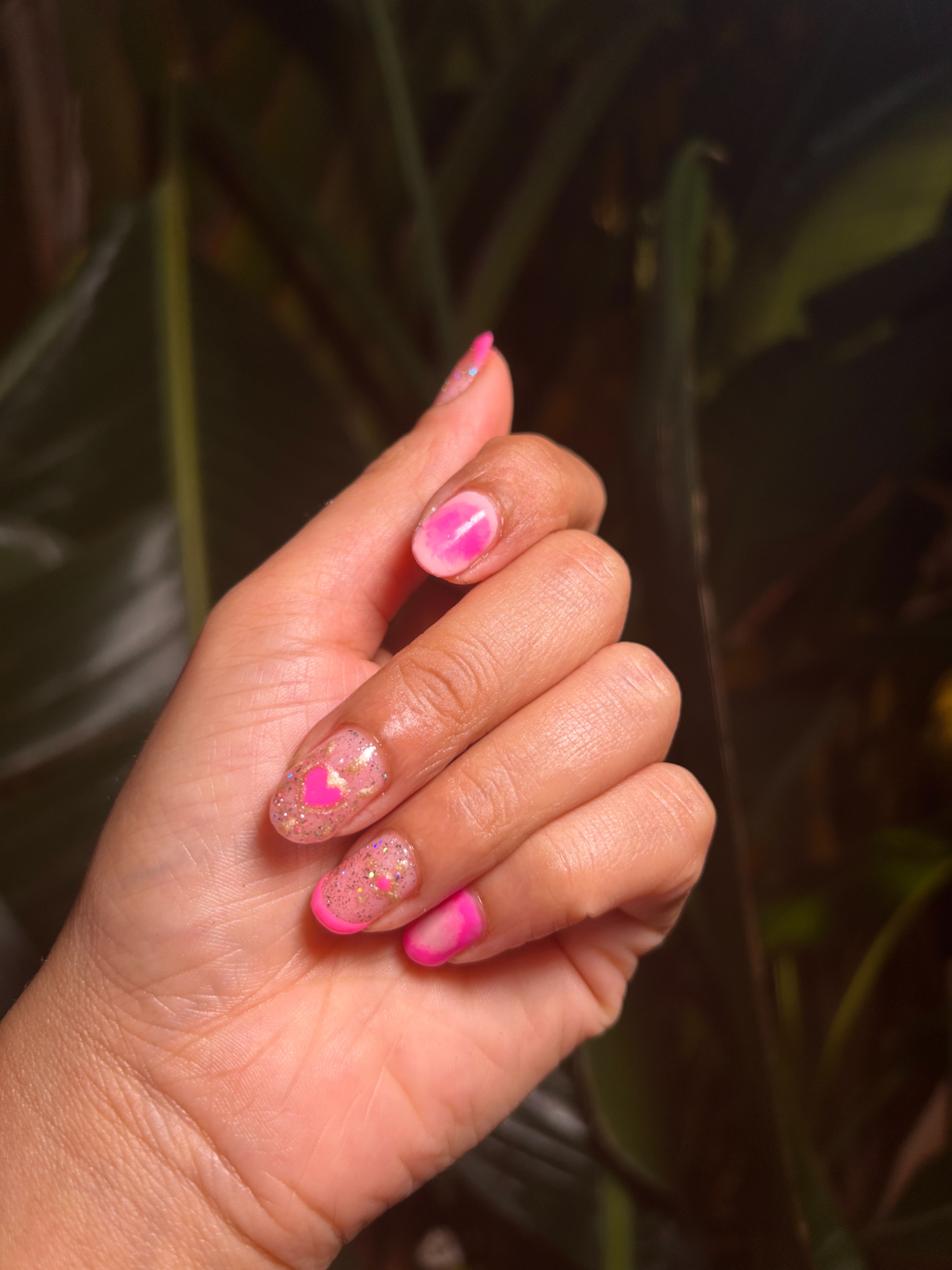 This may be one of my most favorite sets of all time! It took me literally hours because I hand painted all of the elements, but I think it turned out really well! Hand painting the aura nails was way more difficult than I ever could have imagined – but they turned out super cute! And, I kind of love the hearts with the golden outlines!