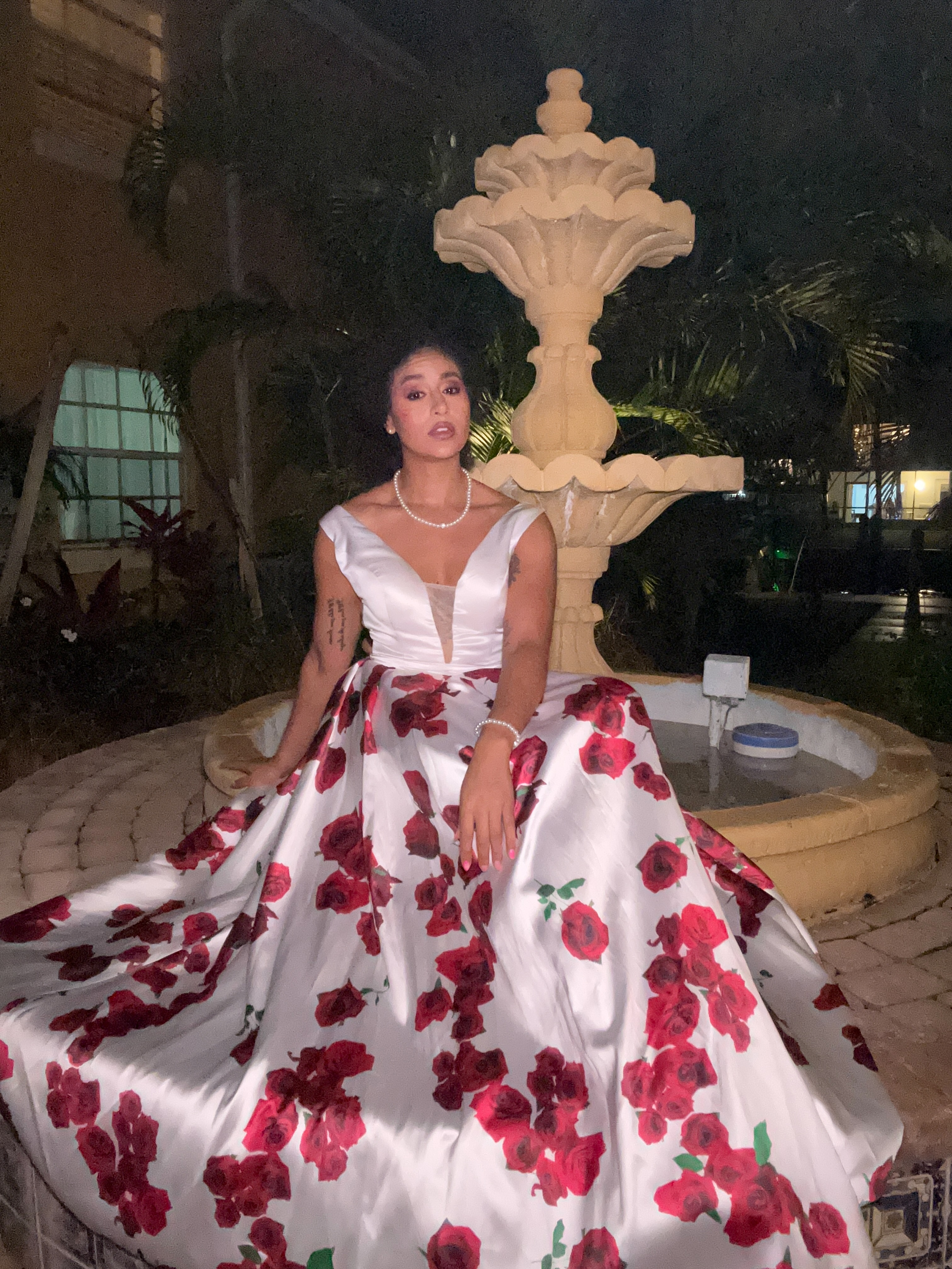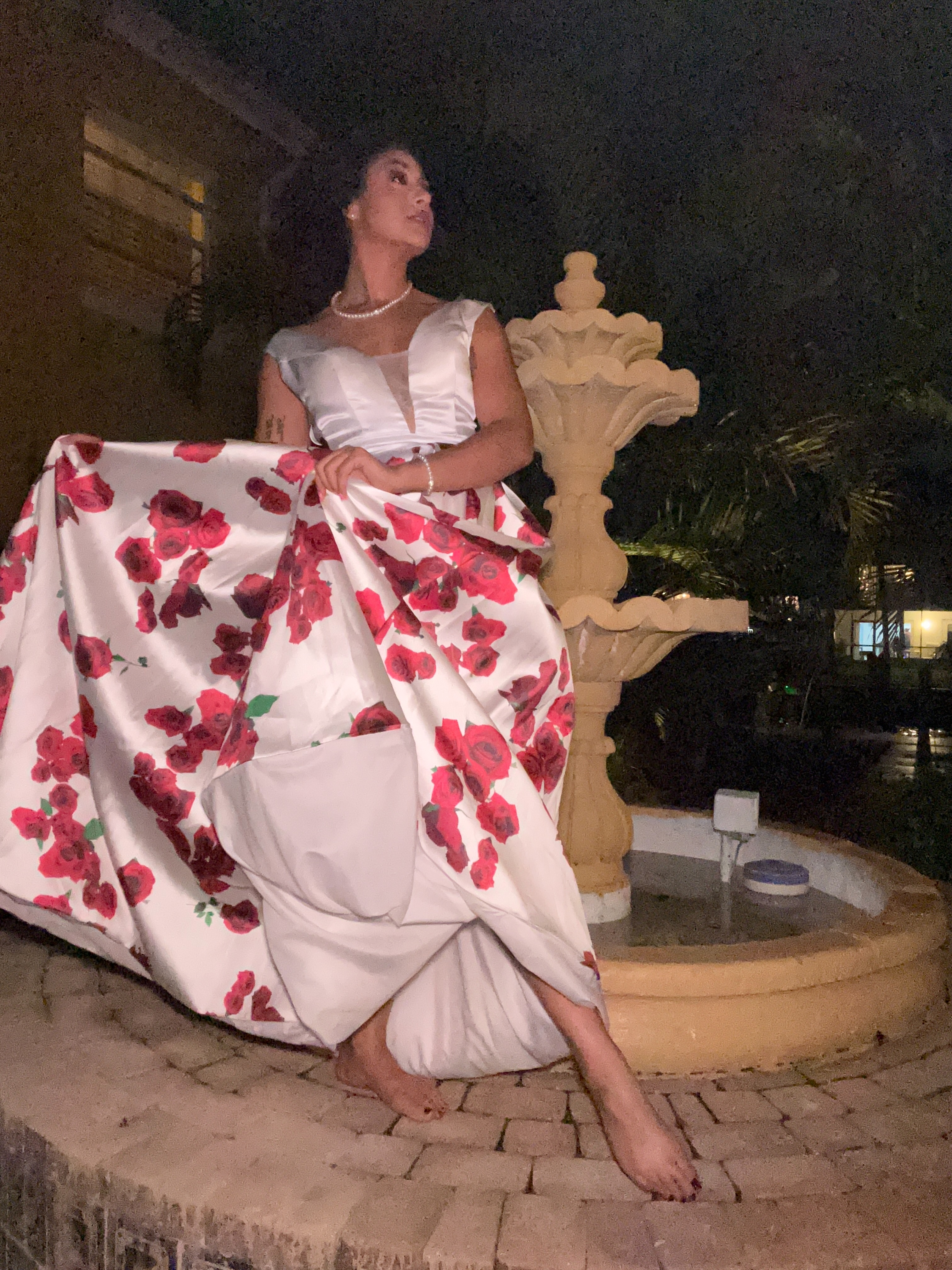 Have plans to go see a play or other theater performance? Then this look is for you! This gown is the perfect item to wear on an outing to see a play or ballet, or even to stage a photo shoot with your friends! I wasn’t able to find a designer in this gown, but here is a selection of floral ball gowns to help you craft a similar look!