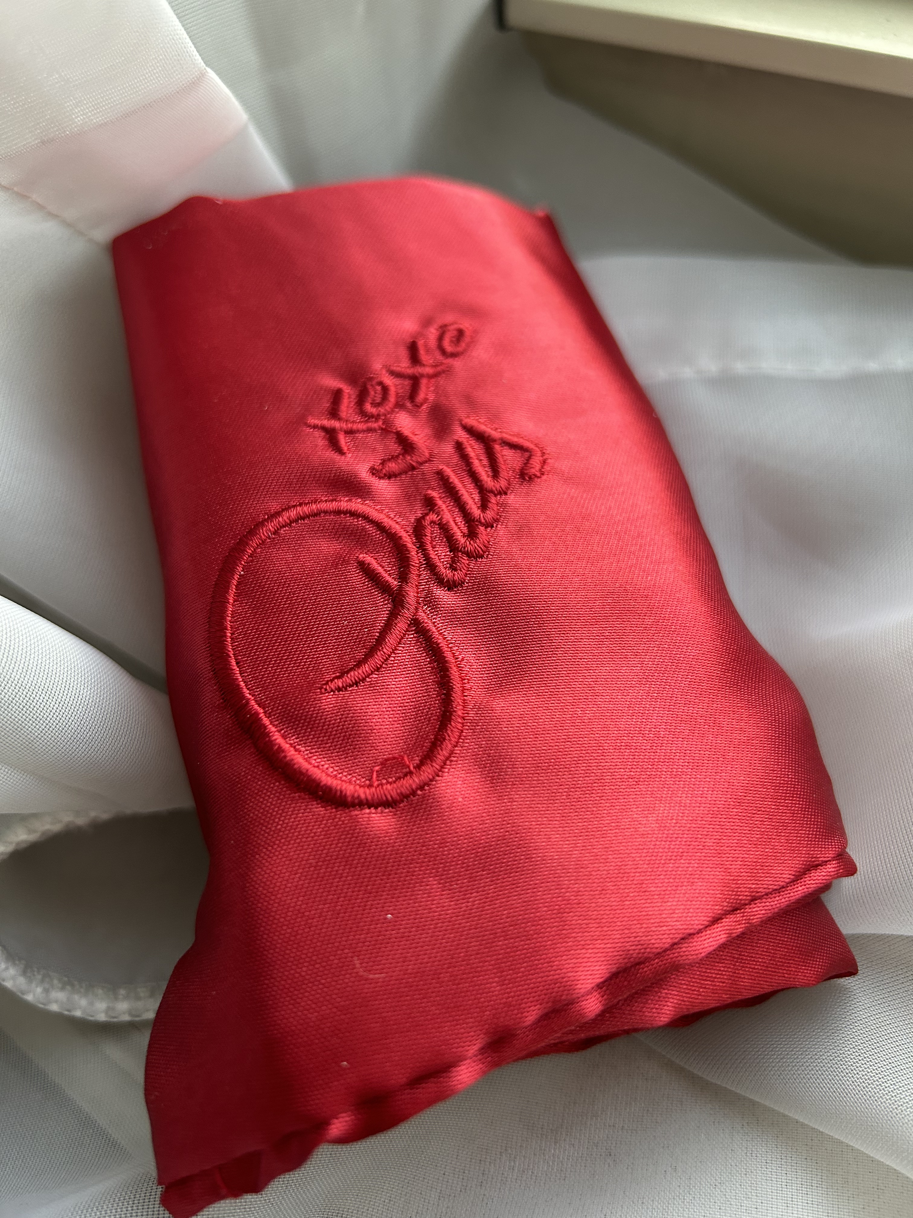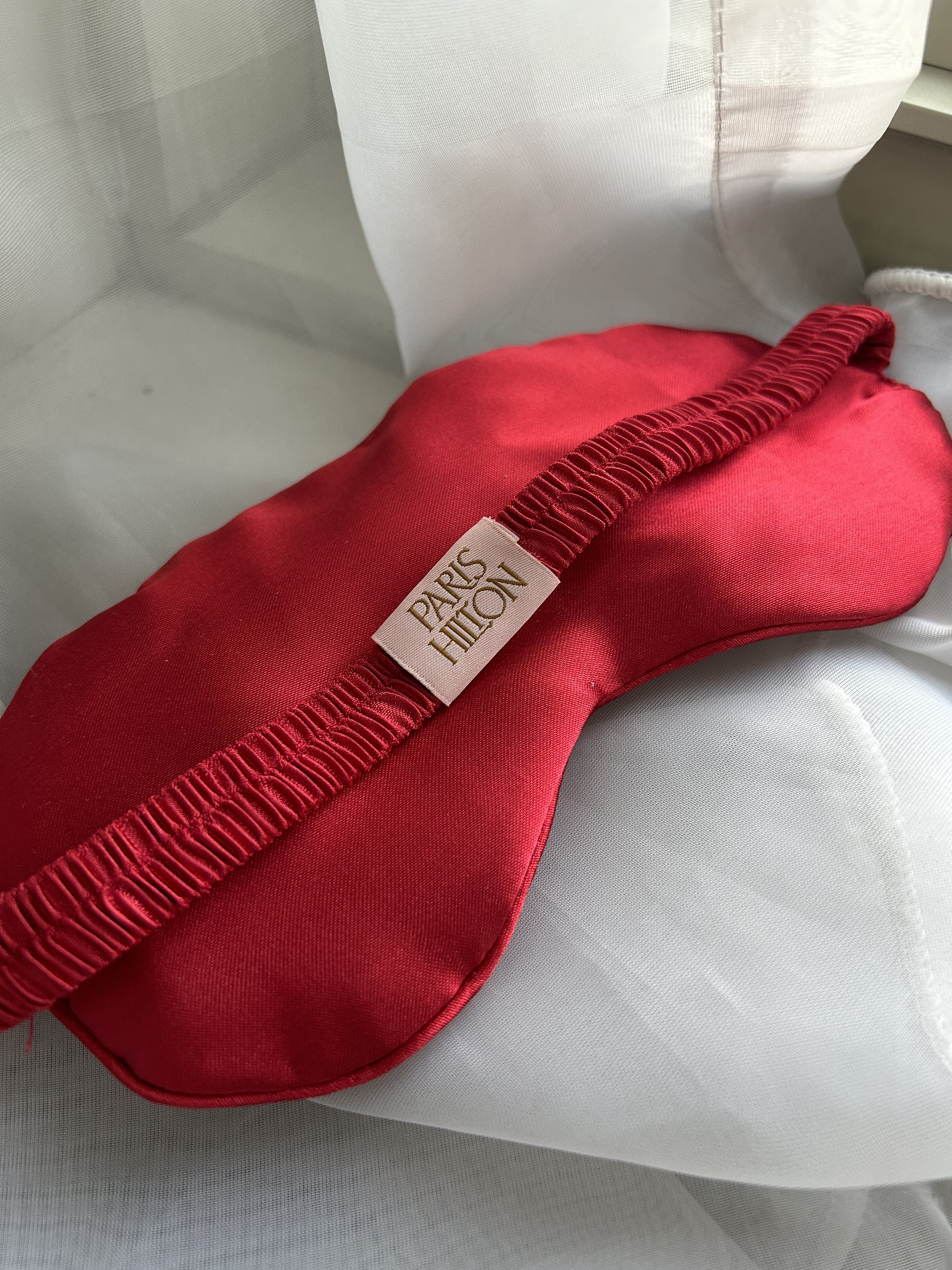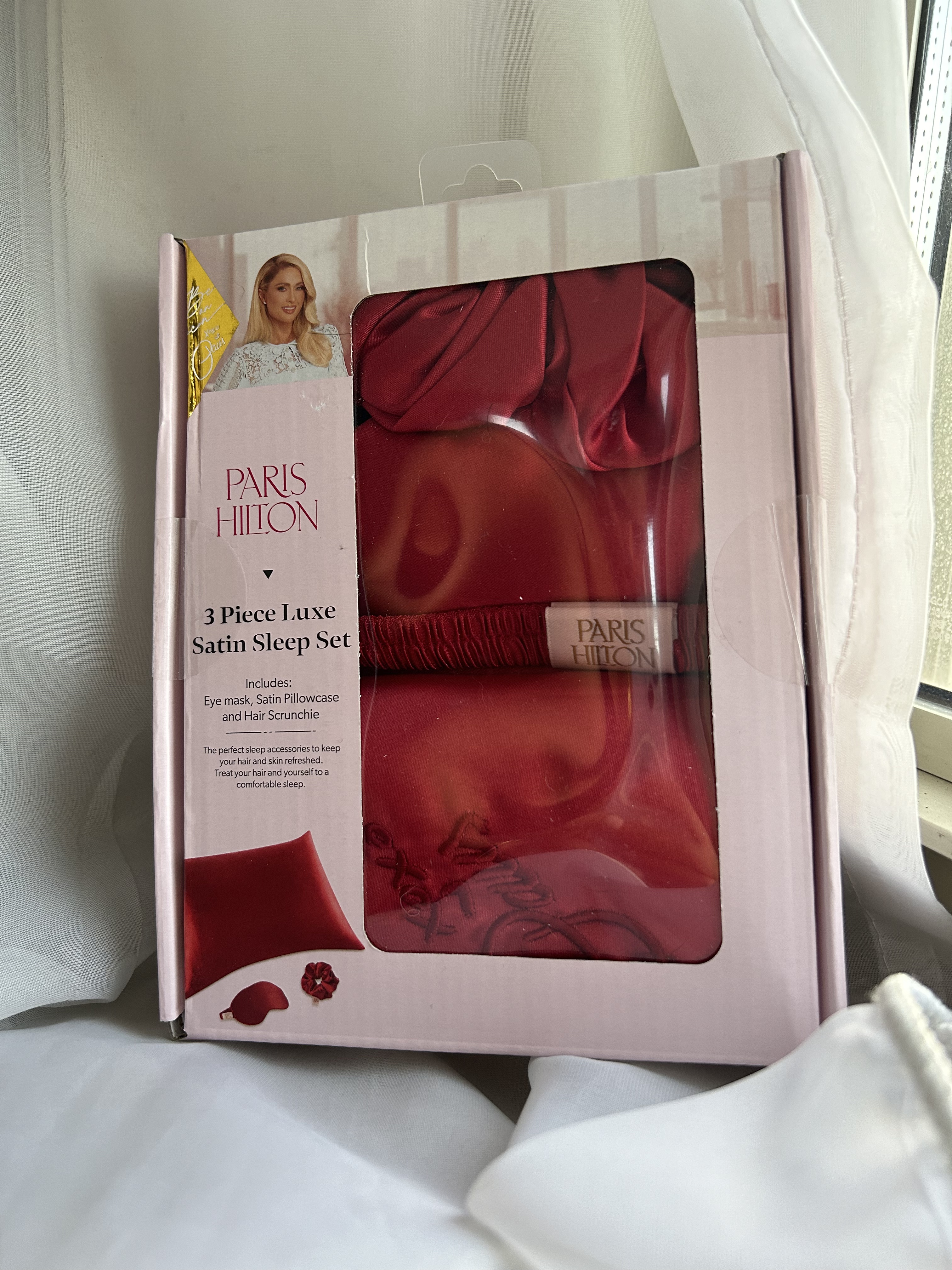 As a proud #CurlyGirly, I treated myself to the Paris Hilton Luxury Satin Sleep Set in red satin, which included a scrunchie, a sleep mask, and an embroidered pillowcase!